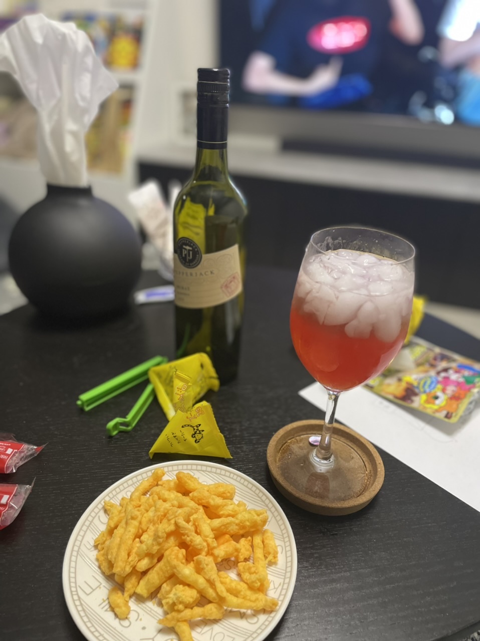 행복열차 환승했읍니다! 와인 베이스 레몬 짜 넣고 블러드오렌지맛 소다랑 약간의 포트와인을 마시던 와인잔에 쏟아넣고 저어 만들었다 맛있다