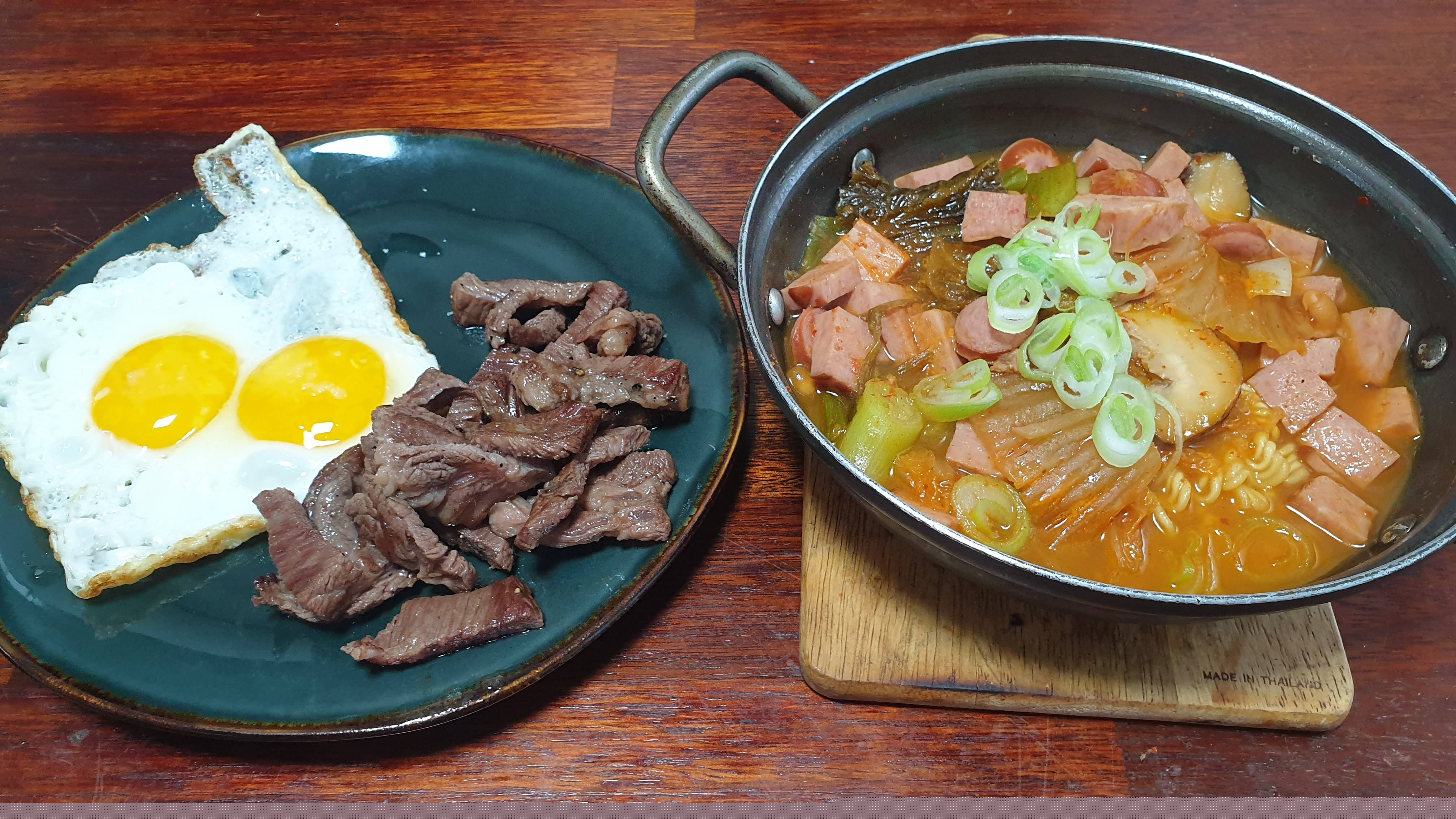 부대찌개라기엔 좀 애매하고 스테이크라기엔 너무 얇고