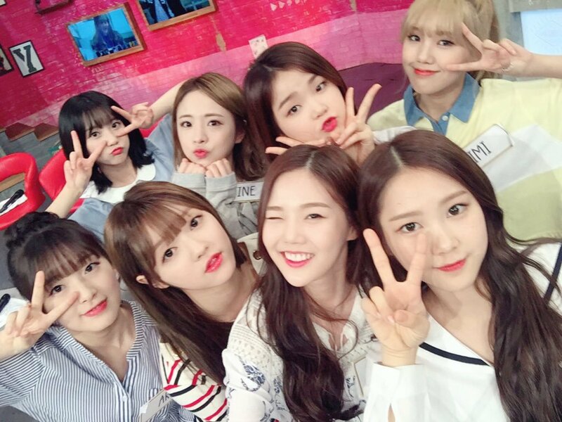 뒤쪽 좌측부터 시계방향으로 유빈(비니), 진이(17년 탈퇴), 승희, 미미, 지호(22년 탈퇴), 효정, 유아, 아린