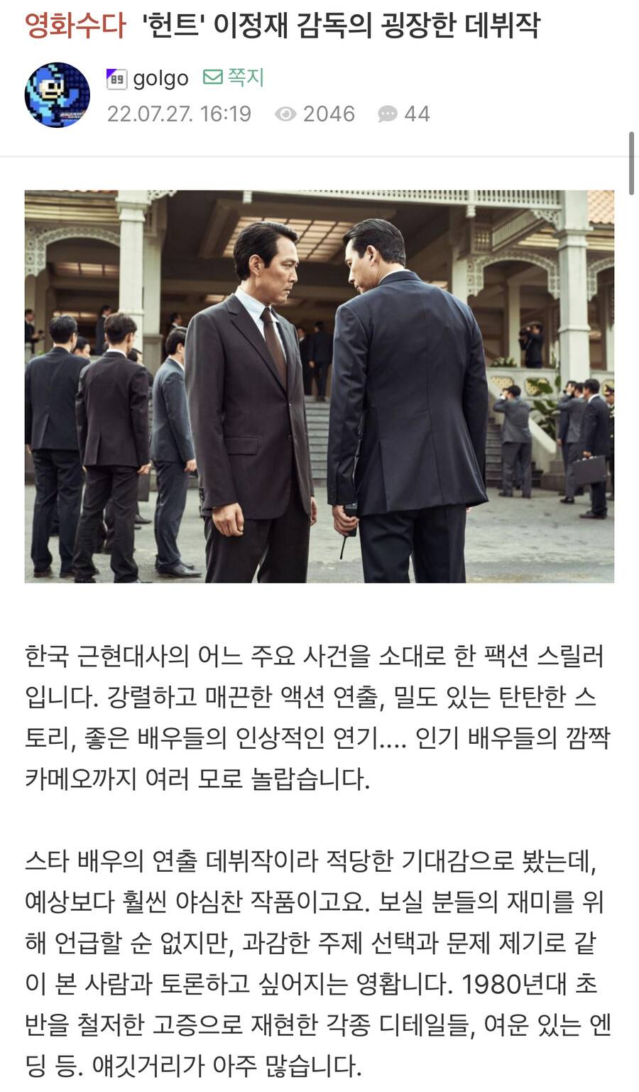 난 좋은 베테랑 배우가 감독으로 데뷔하는 작품은 일단 믿고 보는 편임. 현장에서 구른 짬바가 디테일한 연출에 엄청 잘 녹아듬. 김윤석 입봉작 미성년 한 번 보셈. 왜 이 아저씨가 감독들과 존나 싸워가며 영화찍어왔는지 확실하게 알 수 있음. 아 그리고 평론가 감독데뷔작은 하나같이 좆망이더라.