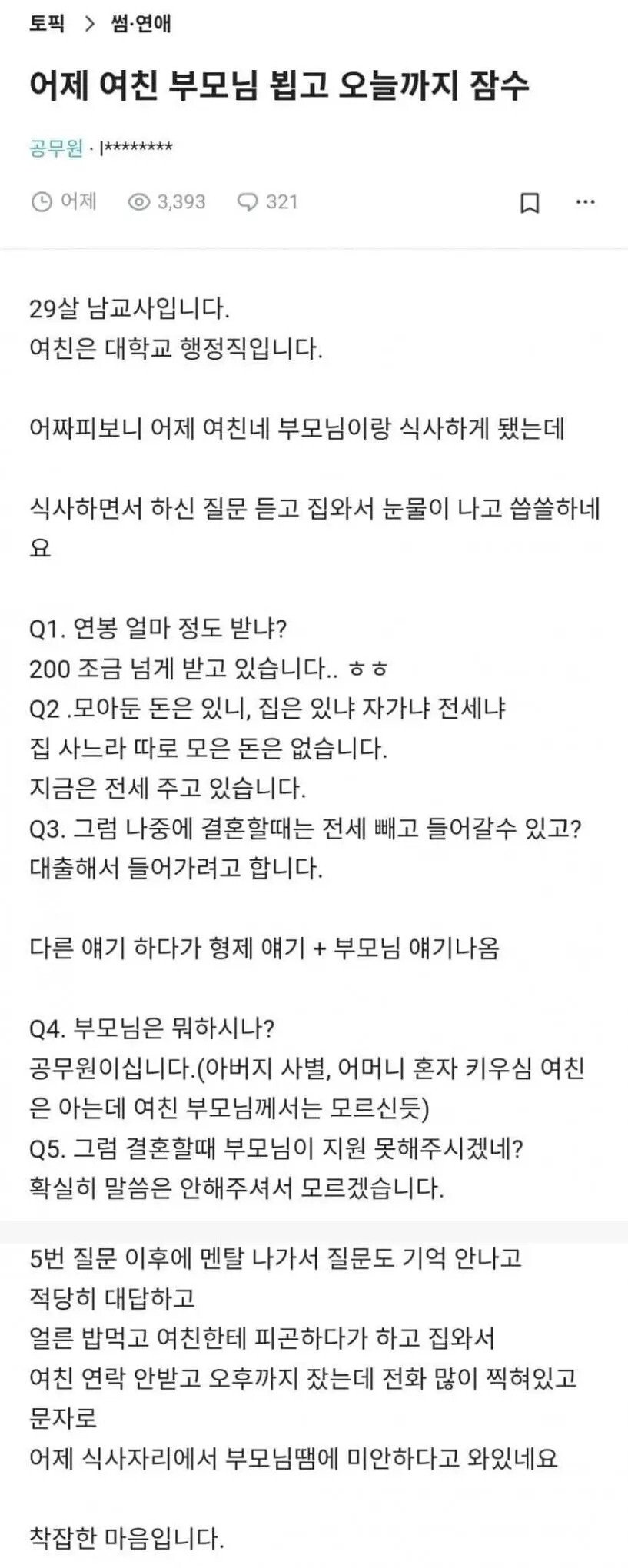 29살 요즘으로 따지면 아직 결혼하기엔 이른? 나이일수 있는데 예상에도 없던 여친부모가 압박면접하듯이 저러면 기분좋을사람이 있을리가 있나 첫만남부터 저러면 정떨어지는게 당연한거 아닌가 싶은데 아닌사람도 있다는거 놀랍긴 해
