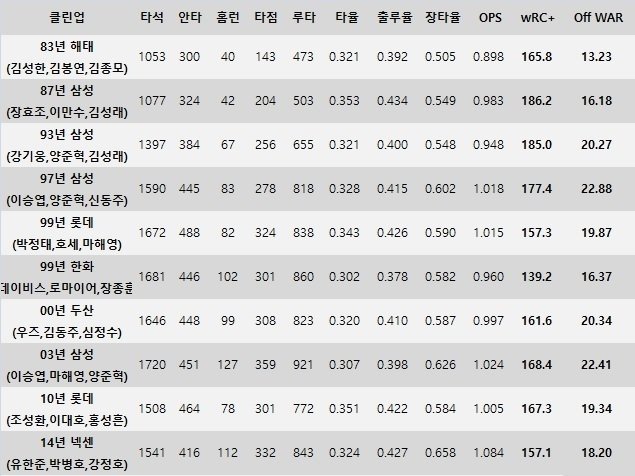 10초반 삼성왕조, 슼 클린업은 비빌대가 아닌듯. 해태도 클린업이 개쩔었다 볼 순 없지. 투수력이 극강으로 쎈팀이었지.