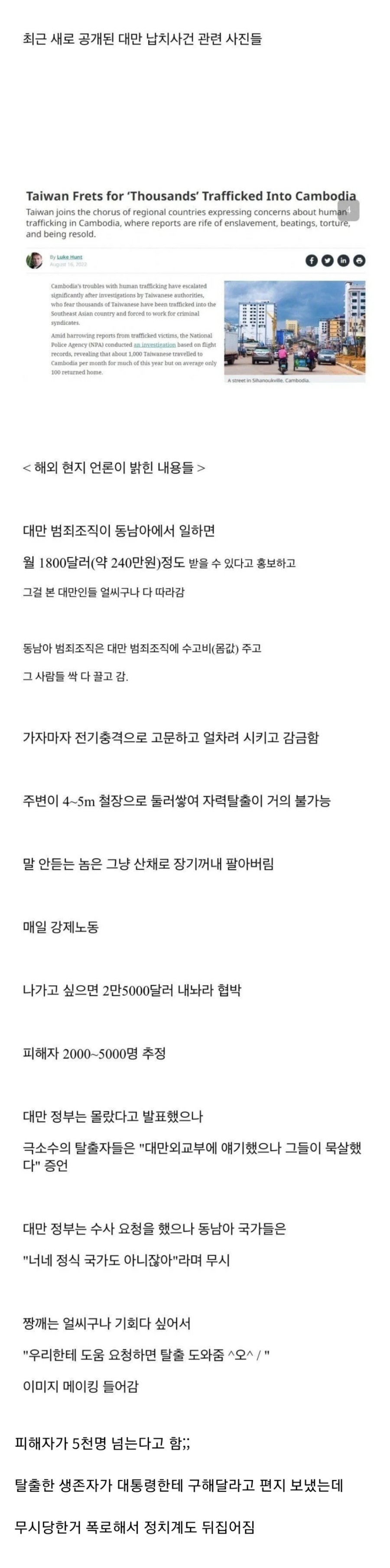 저거 동남아 도시가 중국 조직이 거의 장악한 카지노 도시 같은거란 얘기도 있고 그래서 뒤에 중국범죄조직이 있는거 아니냐는 얘기도 있던데 암튼 국가로 인정을 못받아서 외교관계 자체가 없다는게 저렇ㄱ 악용될 수도 있다는거 첨 알음