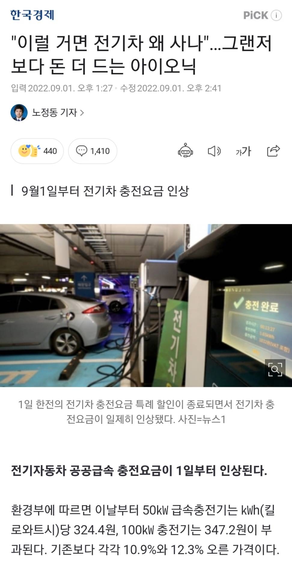 글구 환경부충전 할인이 점차 완화되고 이번에 할인없어진거라 예상된거임 내가차살때 환경부전기차할인 종료기준 휘발류 1300원대기준으로 계산했을때 30프로수준이었던거같음