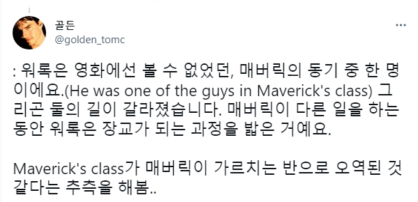 예전에 매버릭이 잠시 탑건 교관 생활했을 때 가르침을 받은 조종사 중에 한명이 워록이었나보다