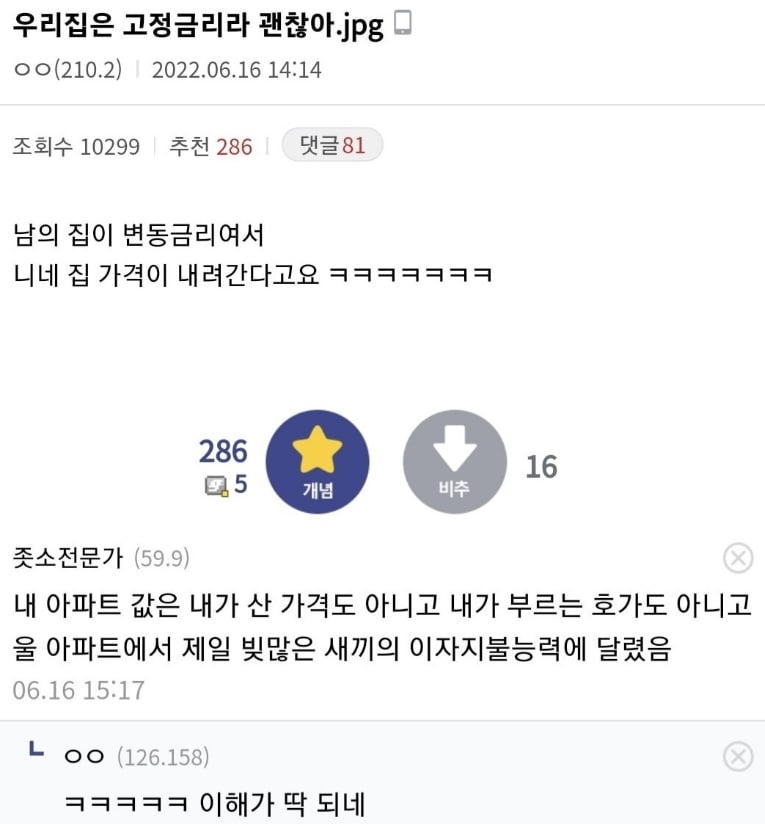 고작 1년도 안되는 조정장에 4억 5억 땡겨서 집산애들 한달 이자가 100에서 200되고 무지성으로 집값은 우상향이라고 나더러 집 빨리사라고 하락론자들을 돈없어서 집도 못사는 거지취급하던것들이나 재앙이취임전에 기막히게 집사놓고 먼 대단한 인싸이트 가지고 투자한거마냥 현자코스프랠 ㅈ빠지게 하던 머저리새끼들 뚝배기 터지는거 보니 속이 다 시원하네(정작 진짜 대상승장이나 무지성롱충인 애들은 이 시기에 임사자로 직종 전환하고 이미 2,3억으로 수십억 차익실현하고 런함 대표적인 무지성 롱충 부읽남 얘도 지가 뇌절발언 해놓고 이 사태가 오니 무슨 젊은 꼰대 빙의해서 지보다 10살도 차이안나는애들한테 인생 꼰대질중임 ㅂㅅ..)