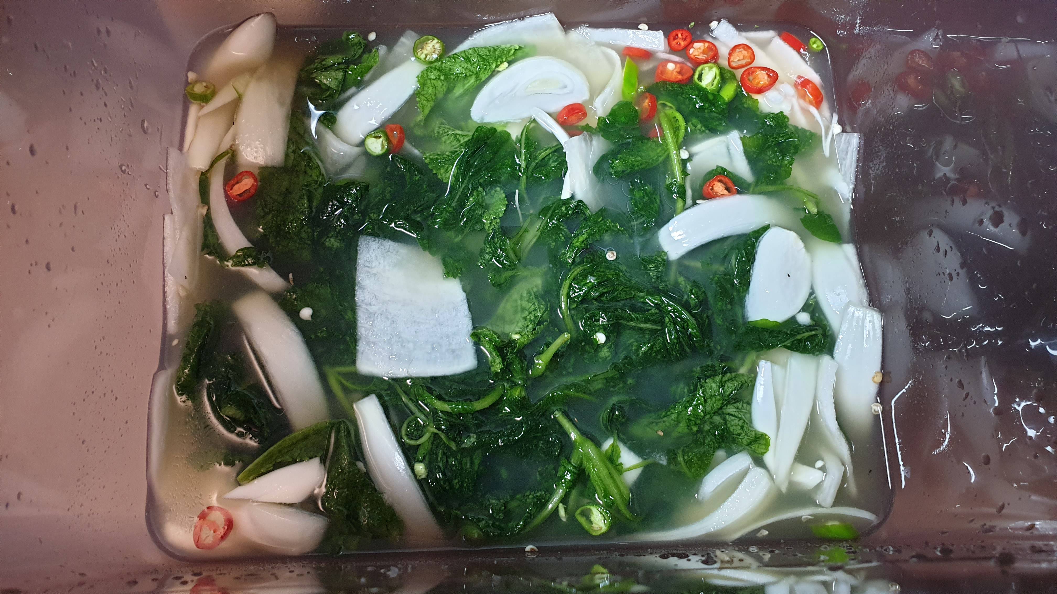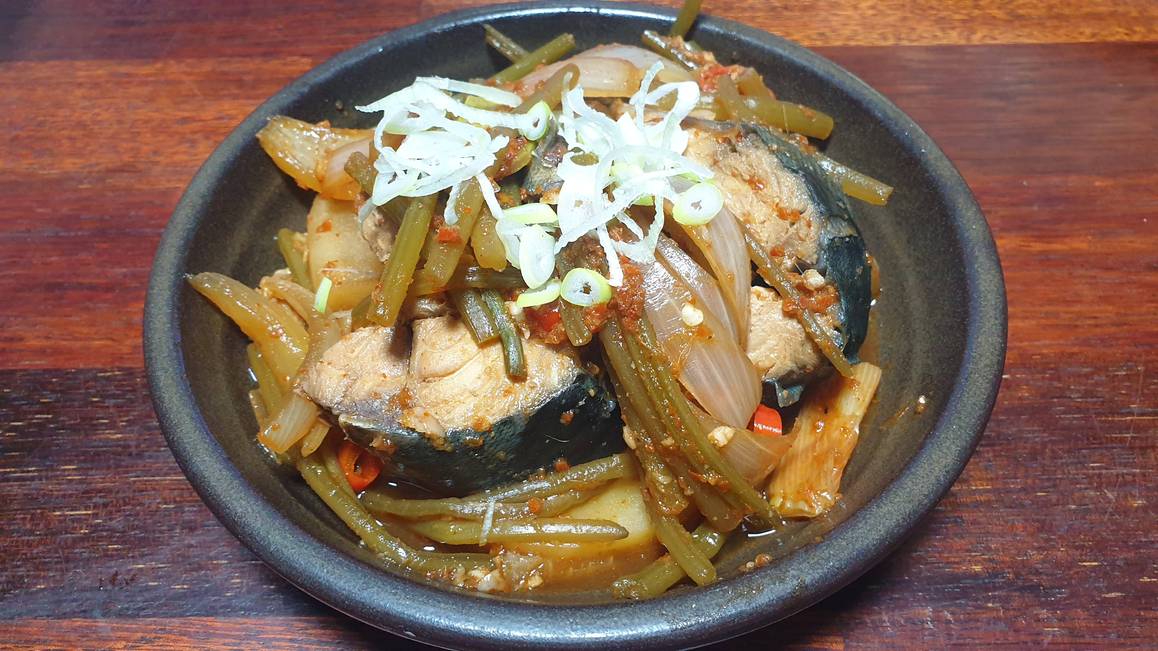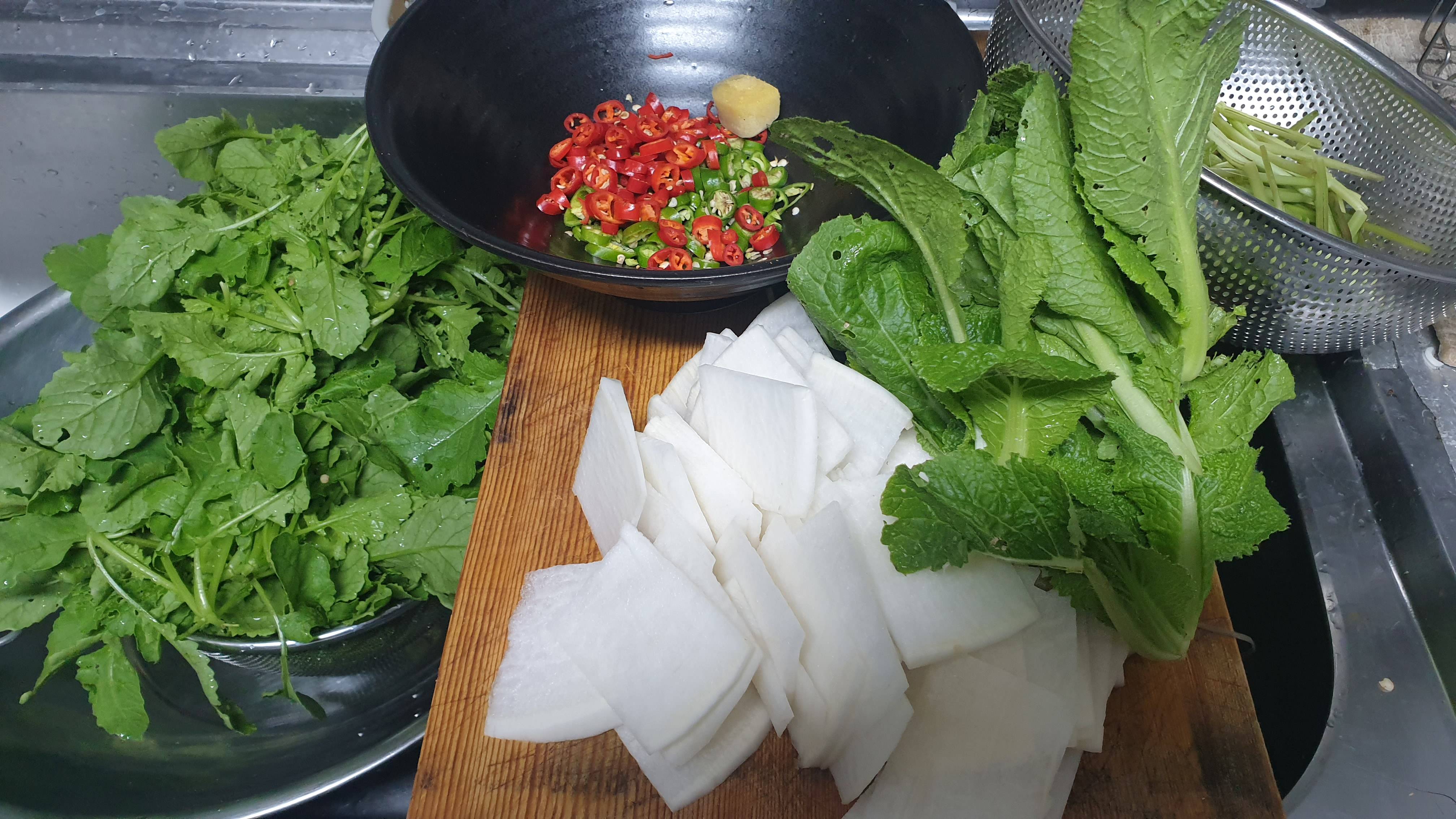 텃밭에서 무잎이랑 배추 캐서 물김치 담그고 고구마줄기는 고등어조림