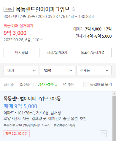 목동 2020년식 국평이 9억3천에 실거래 되고, 나와있는 물건도 9억5천에 올라온거 있음.