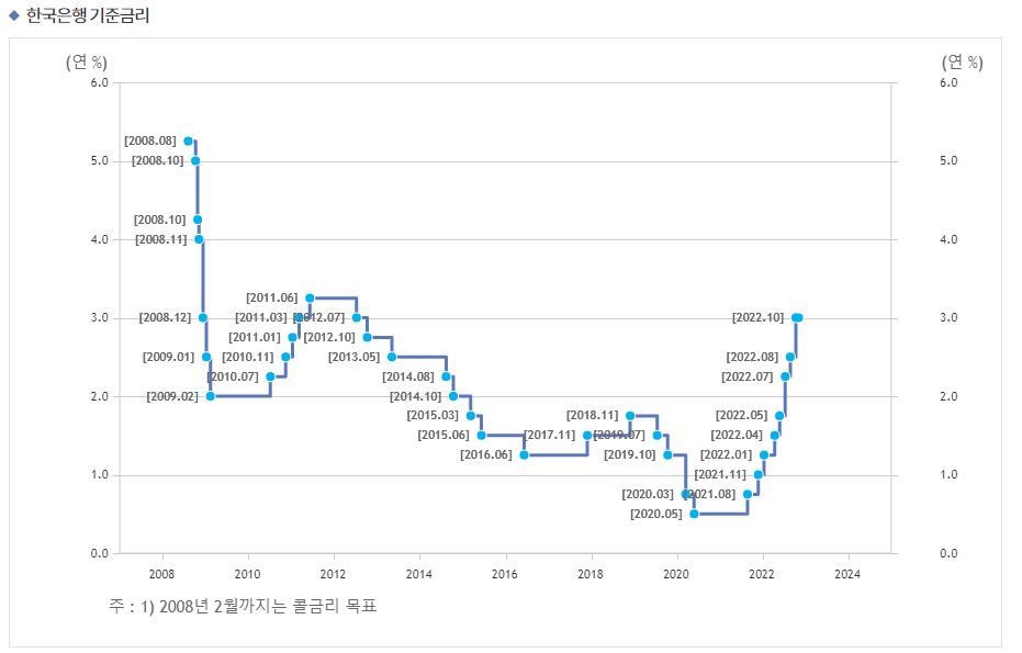사실상 2008년 리먼브라더스 사태 이후 우리세대(지금 20대후반부터 40대초반까지)는 아이러니컬 하게도 단 한번도 고금리 시대를 겪어보지 못했다. 미국기준금리 이제 5%된다지? 그럼 우리나라도 최소한 4%까지 맞춰서 올라갈텐데 그게 언제인지 봐바라 무려 2008년 11월이다. 지금 금리는 14년만에 겪는 한 번도 경험해보지 못한 시장임