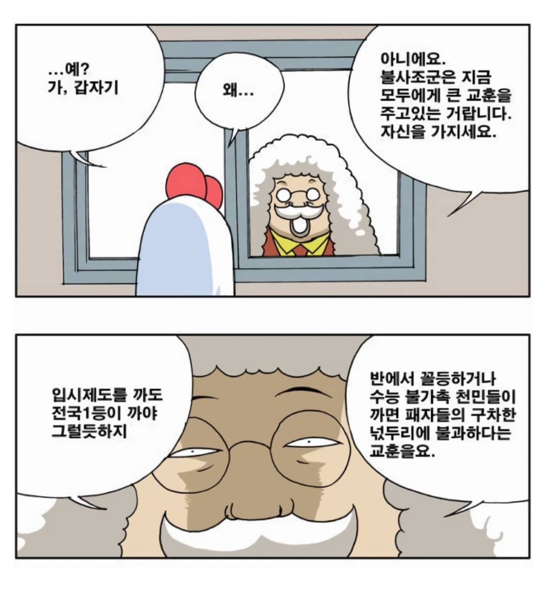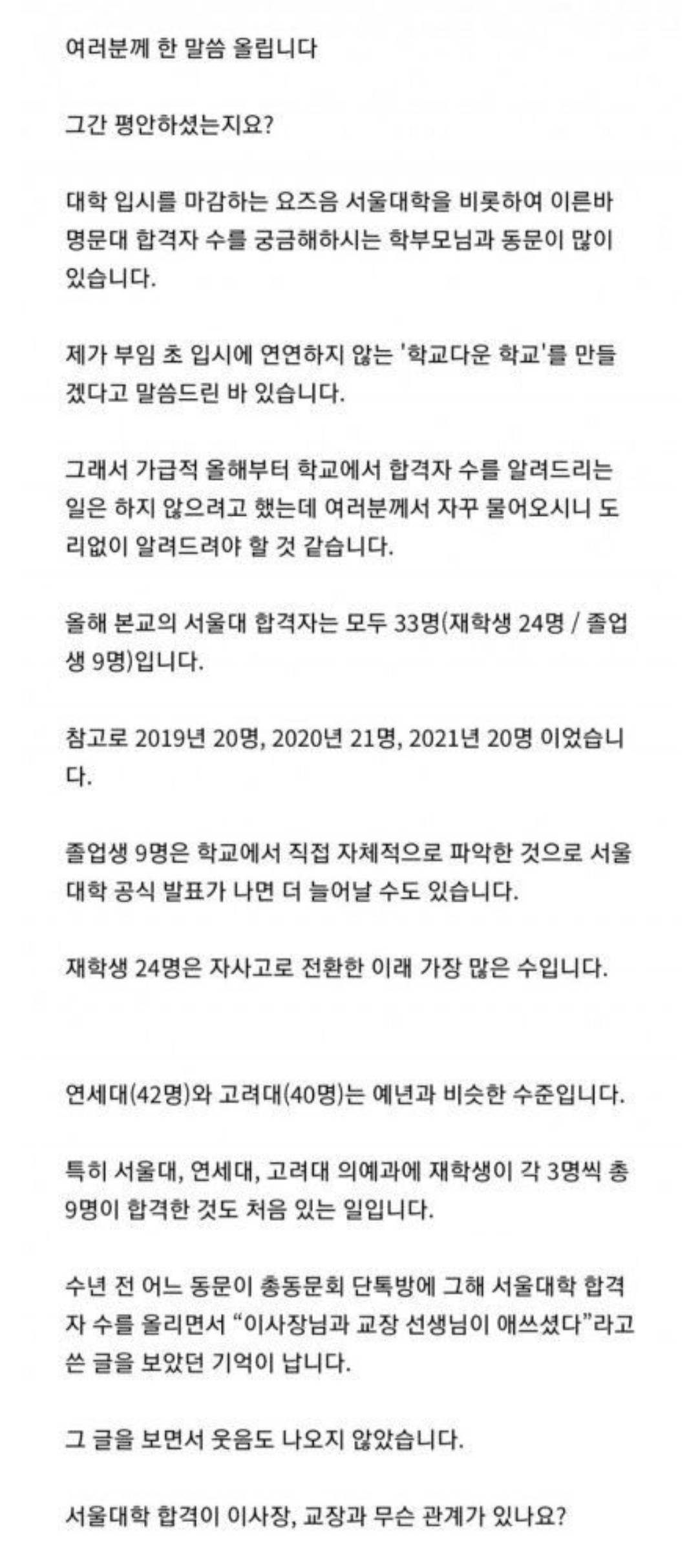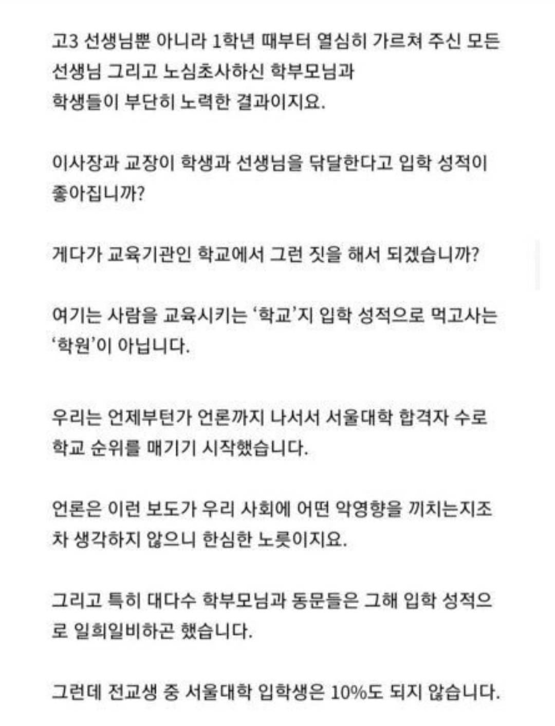 이런말도 1년에 스카이 100명보는 고등학교 이사장이 말해야 설득력이 있지 3명보내는 꼴통학교 교장이 이딴소리하면 패배자의 넋두리지