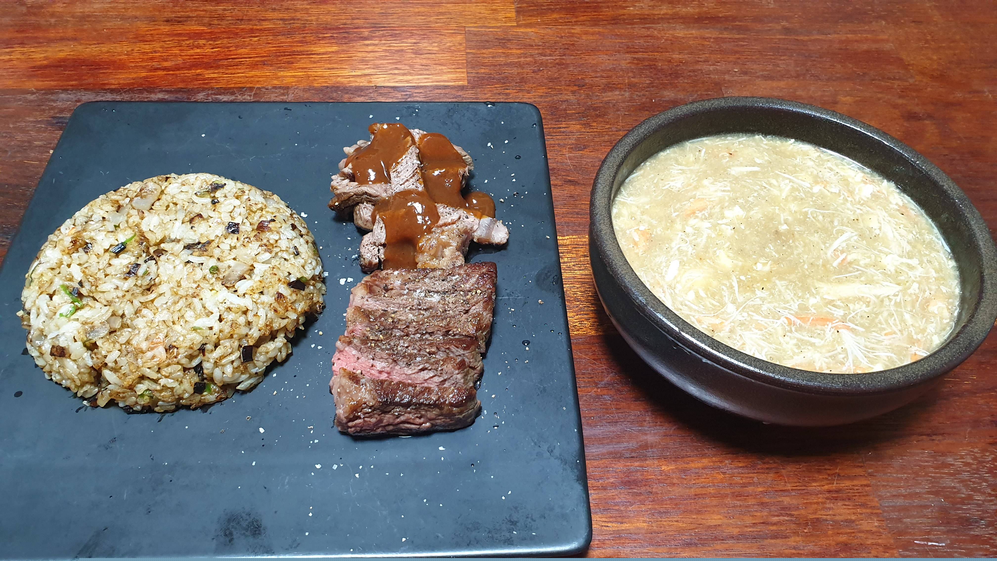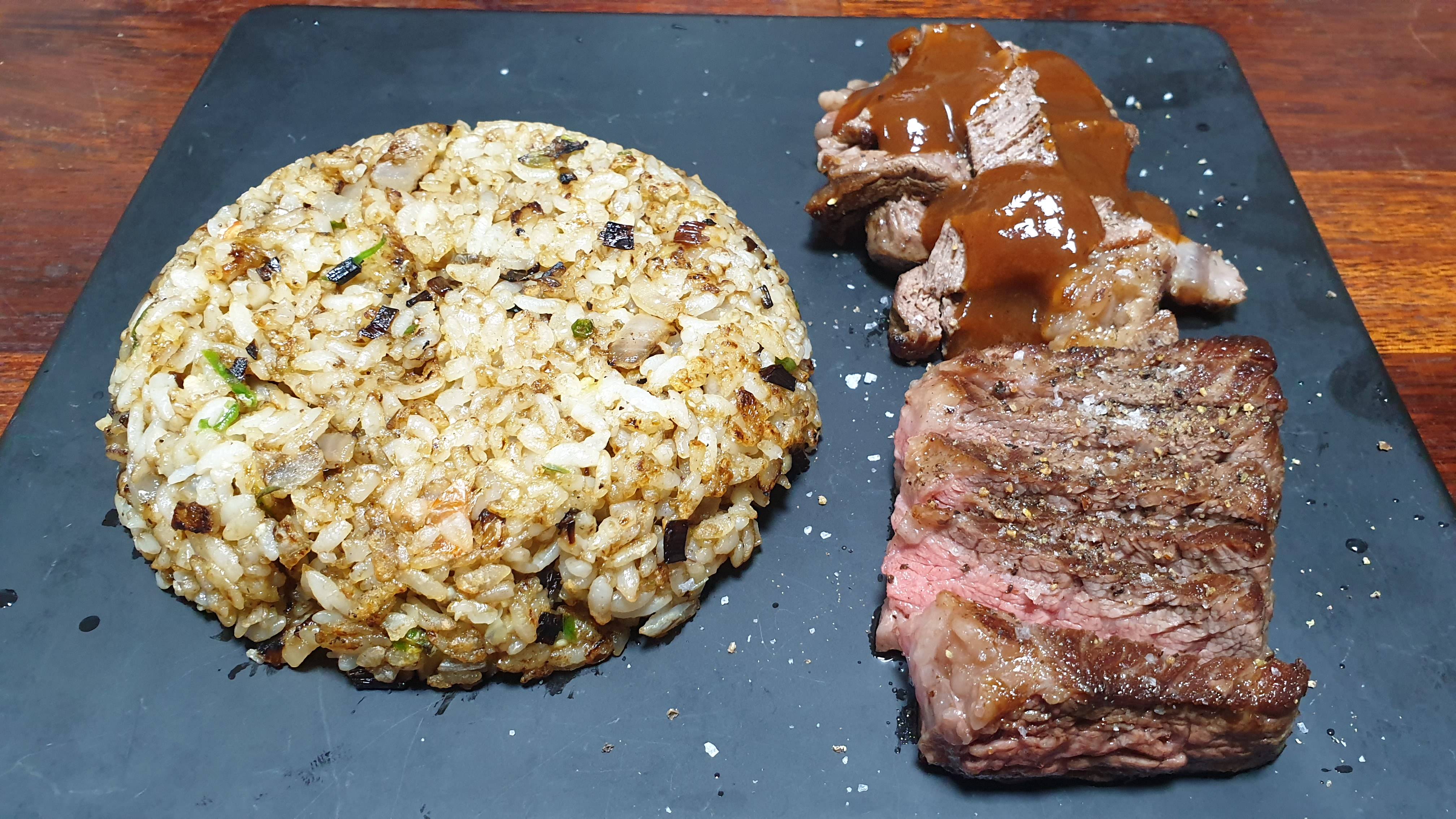 대게내장을 맵싹하게 볶은 볶음밥과 스테이크