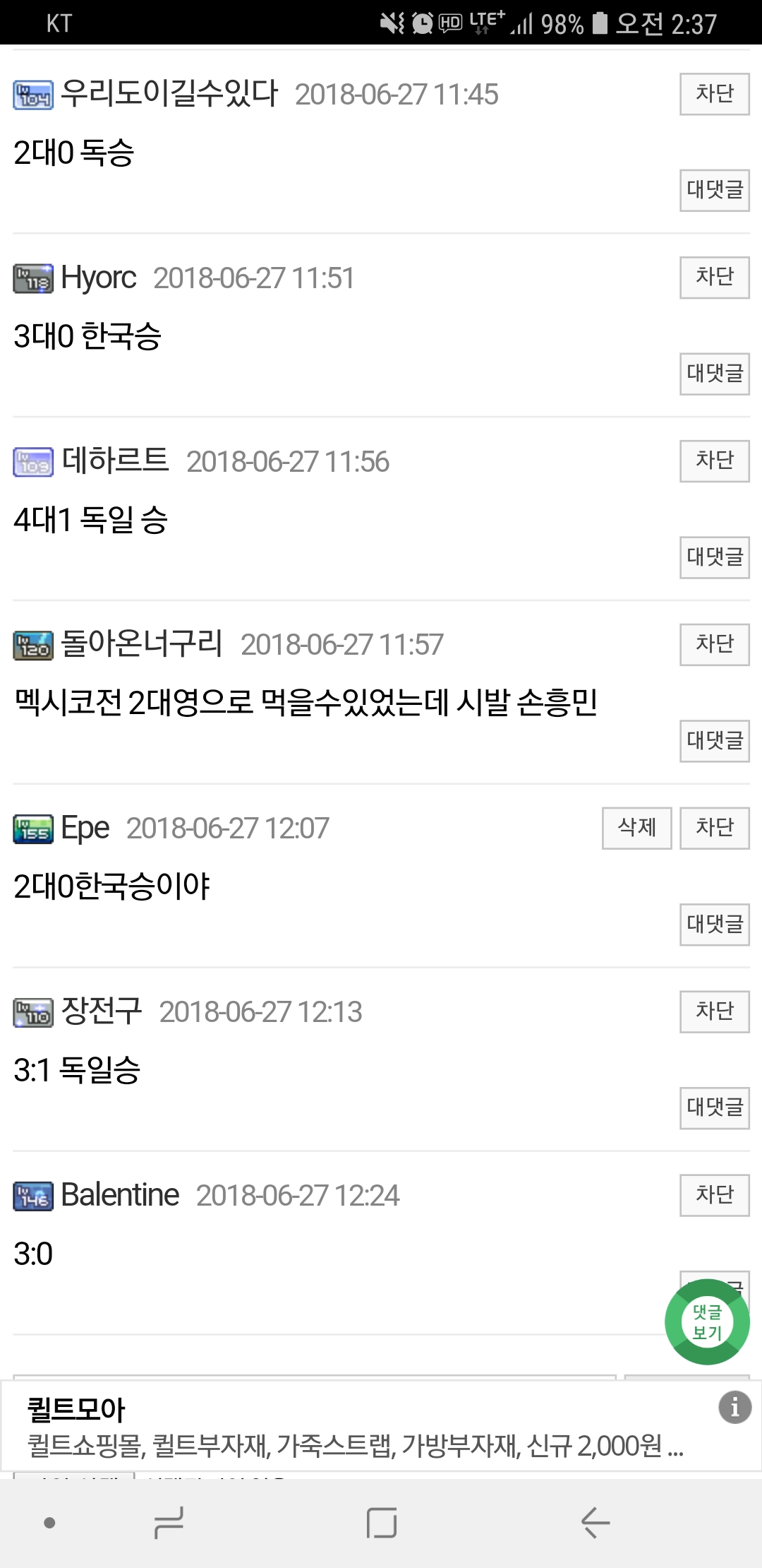 우리나라가 지거나 무승부라고 하는놈들은 치킨에 나라 팔아먹는거지 완죤