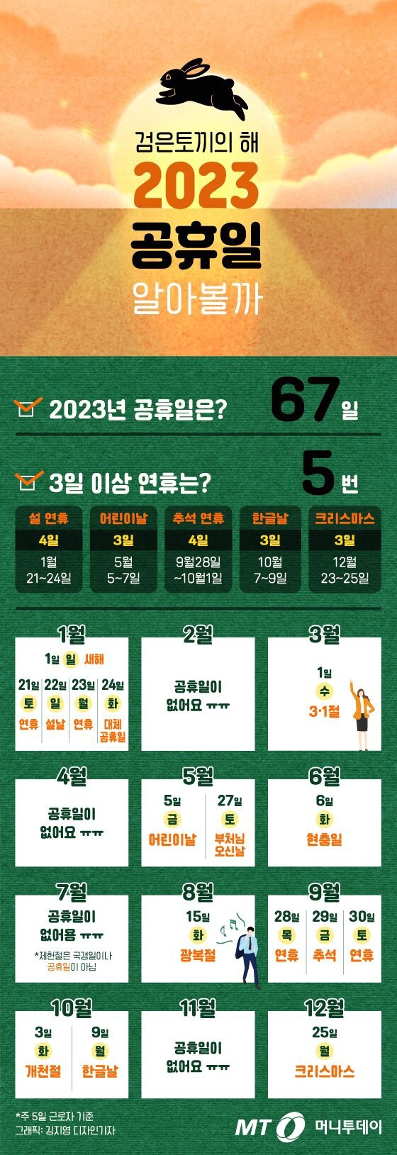 67일이라니 공휴일에 일요일도 포함하나? 이렇게보니 주말빼면 휴일이 11일이네