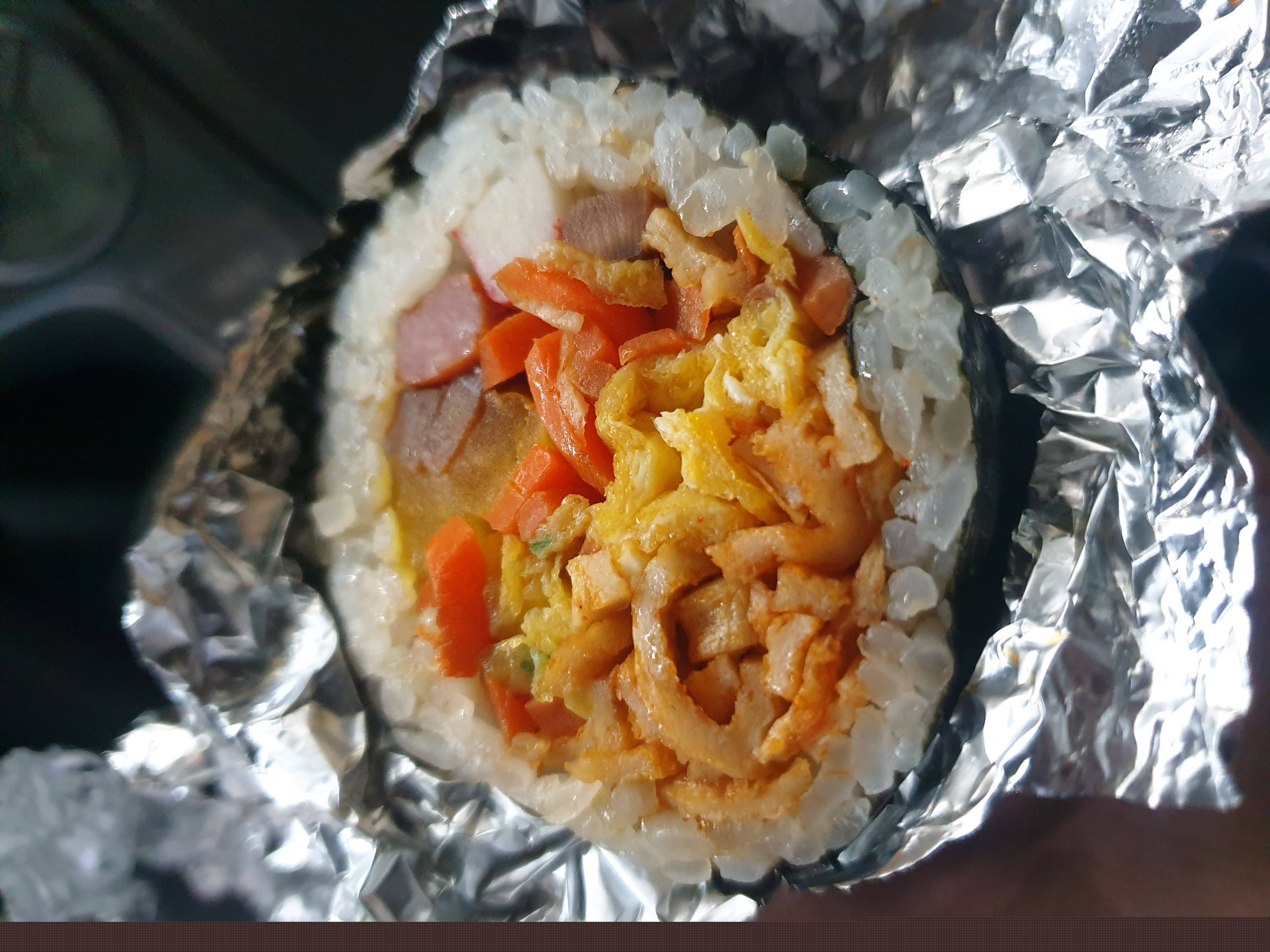 3천원짜리 김밥옆구리가 터지게 속을 넣어줬는데 많이 넣으려다가 옆구리 터졋다고 미안해하시길래 김이 사장님 마음을 못버티네요라고 해주고 받아옴