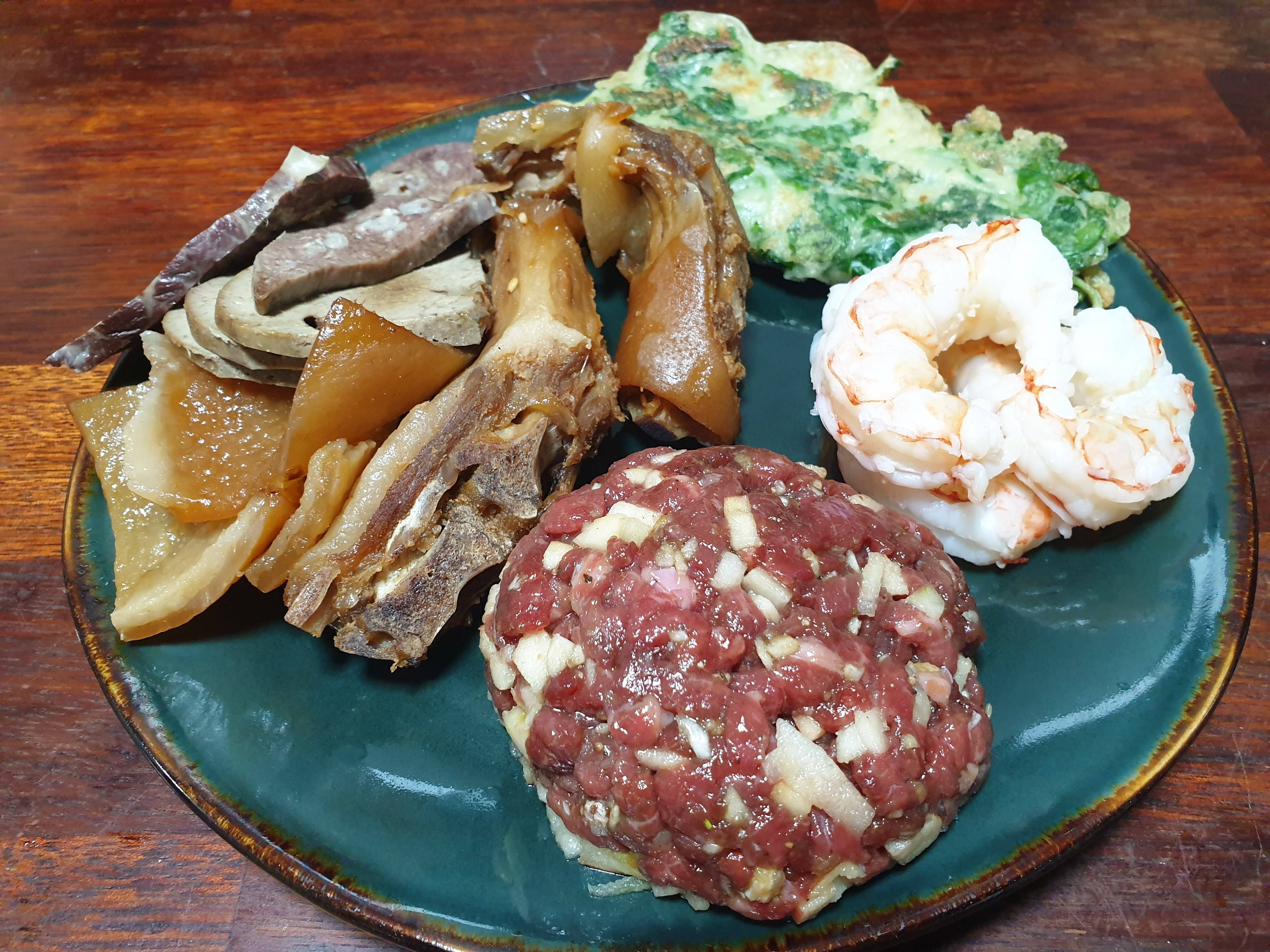 타르타르는/ 다진 육회에 다진마늘 사과를 작게 주사위썰기/다이스 했는데 그 것보단 걍 타르타르 한 걸 사과 얇게 편 썰은거위에 올리는게 더 맛있었겠다