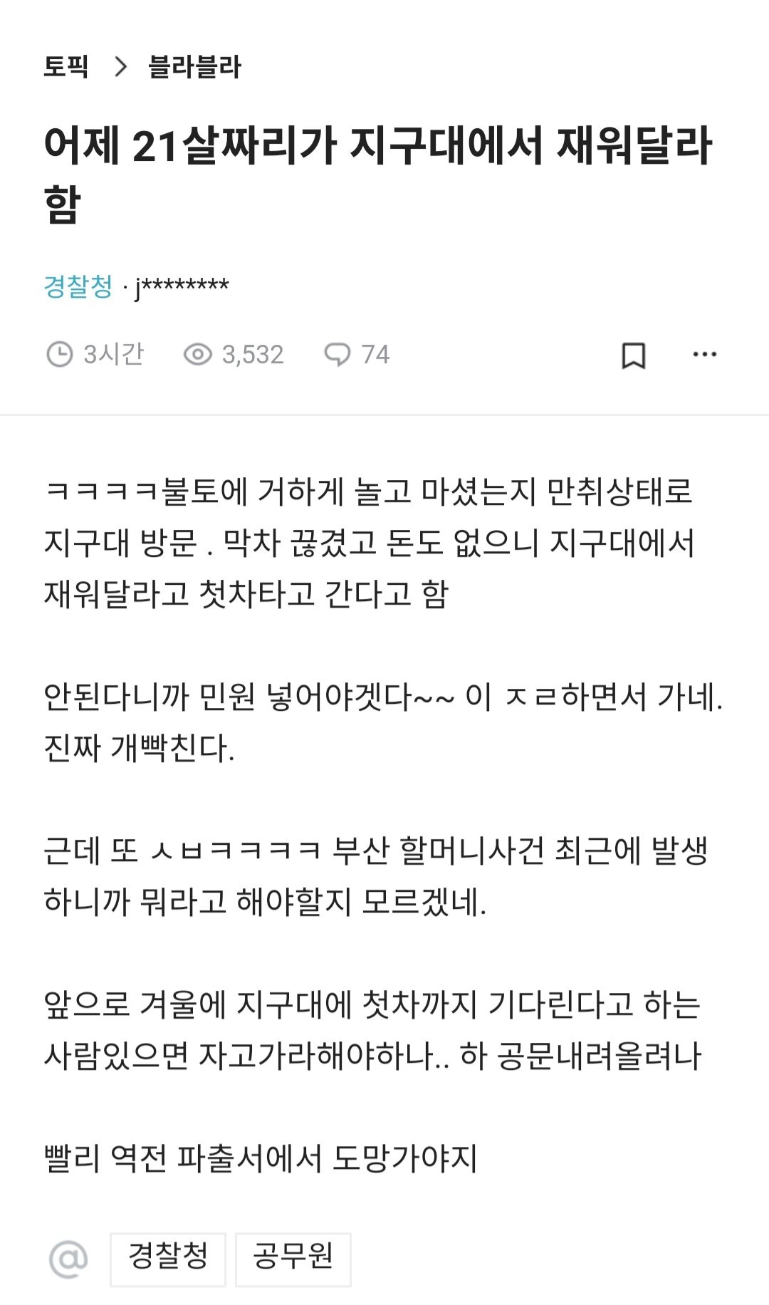추운날씨에 술쳐먹고 노상에서 자빠져있는거 신고들어와서 건져오는것도 참 좆같을텐데 대놓고 저러는건 맞아야 정신차리지