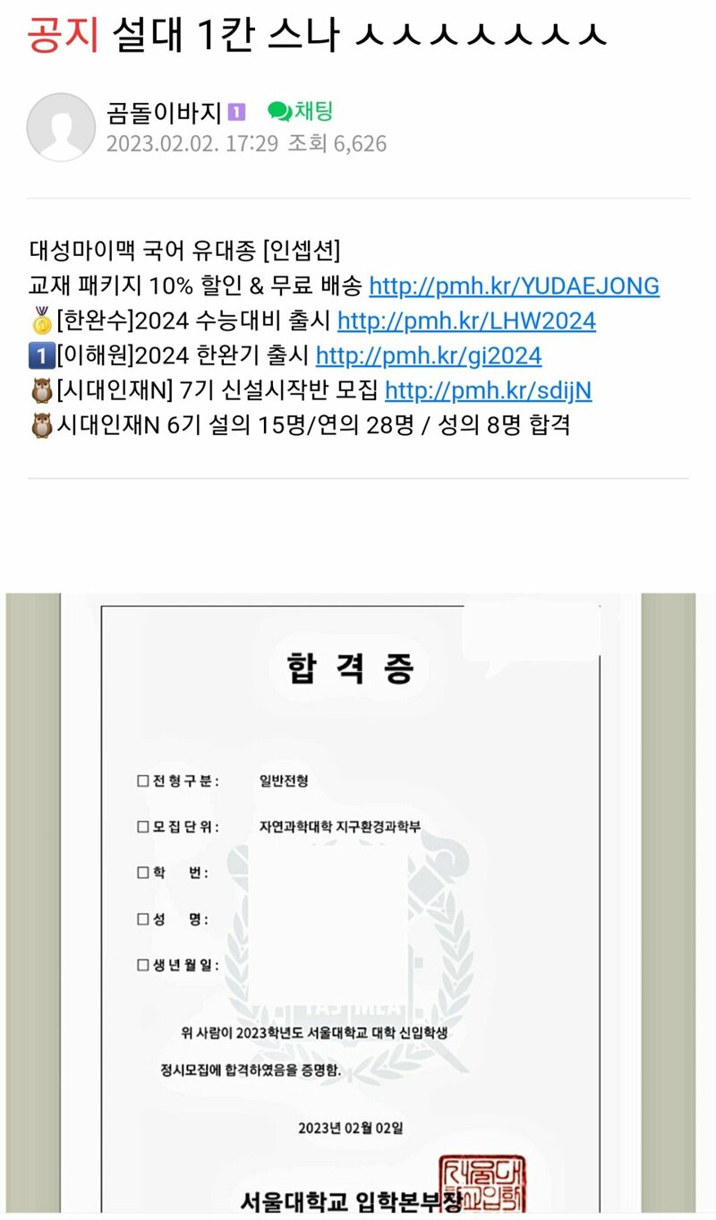 서울대가 3등급으로 지원되는것도 신기한데 그게 붙네