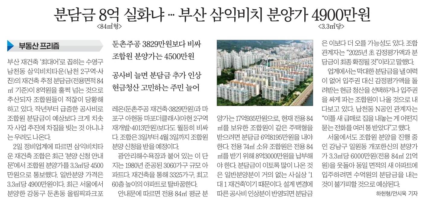 광안리에선 해운대 조선비치 랑 위치가 비슷 광안대교 바로앞 원래 부촌 해운대 좋아지기 전엔 최고 바다 바로 옆이라 지반이 약하니 어쩌니 말이 많아서 공사비 많이 들지도 건축은 잘 몰?루