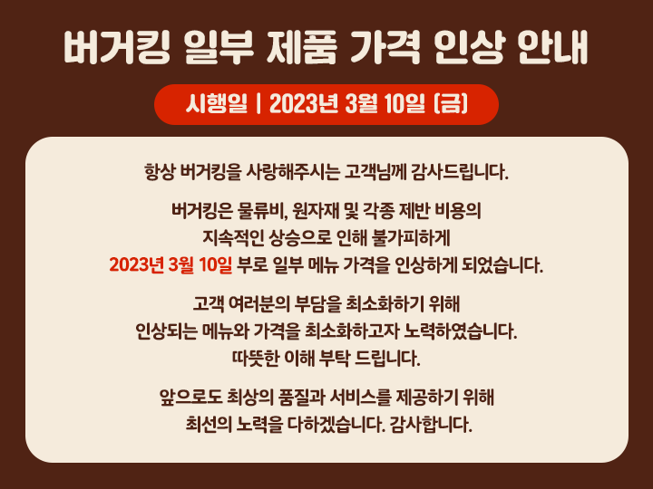 버거킹은 공지 없이 가격을 계속 올려왔고 이번에 공지 후 3%인 200원만 올린것처럼 보이지만 실질적으로 매달 80원씩은 가격을 올렸기 때문에 작년 기준 가격 대비 16.5% 상승