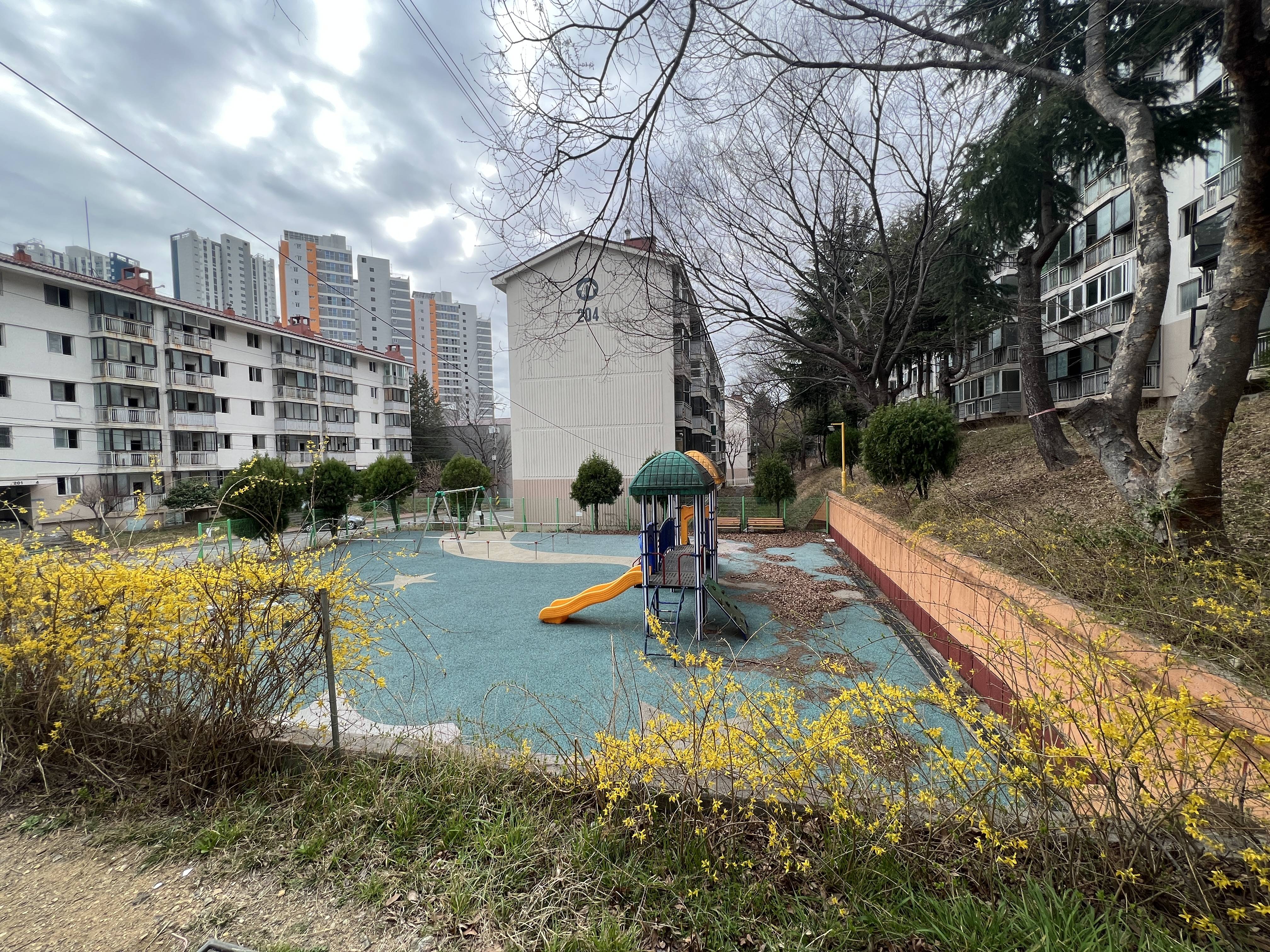 놀이터인데 원래 옛날에는 다 모래바닥이었는데 우레탄으로 다 바꿧더라고 놀이기구도 전부 싹 바꼈음