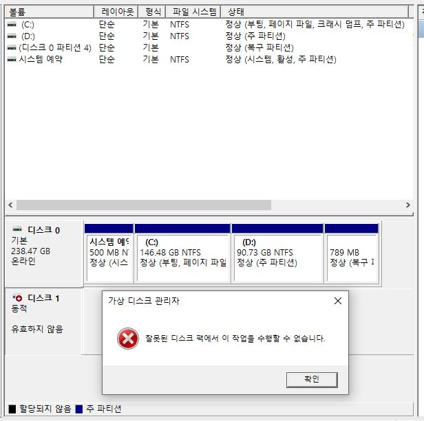 디스크 자체가 유효하지 않다고 뜨고 연결 하려고 해도 위와 같은 창이 뜸