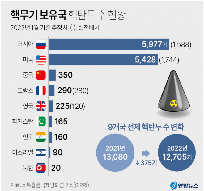 예전에도 얘기 했지만 핵무기 보유수량부터 넘사벽으로 차이나기 때문에 핵무기로 싸우면 상대가 안됨
