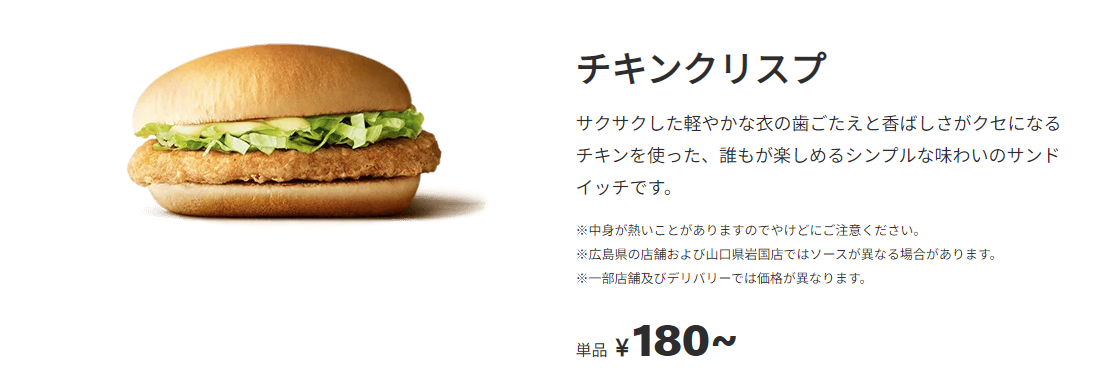 치킨크리스프(한국으로치면 맥치킨에 참깨번빠진거) 100엔이었는데 180엔으로 올랐네