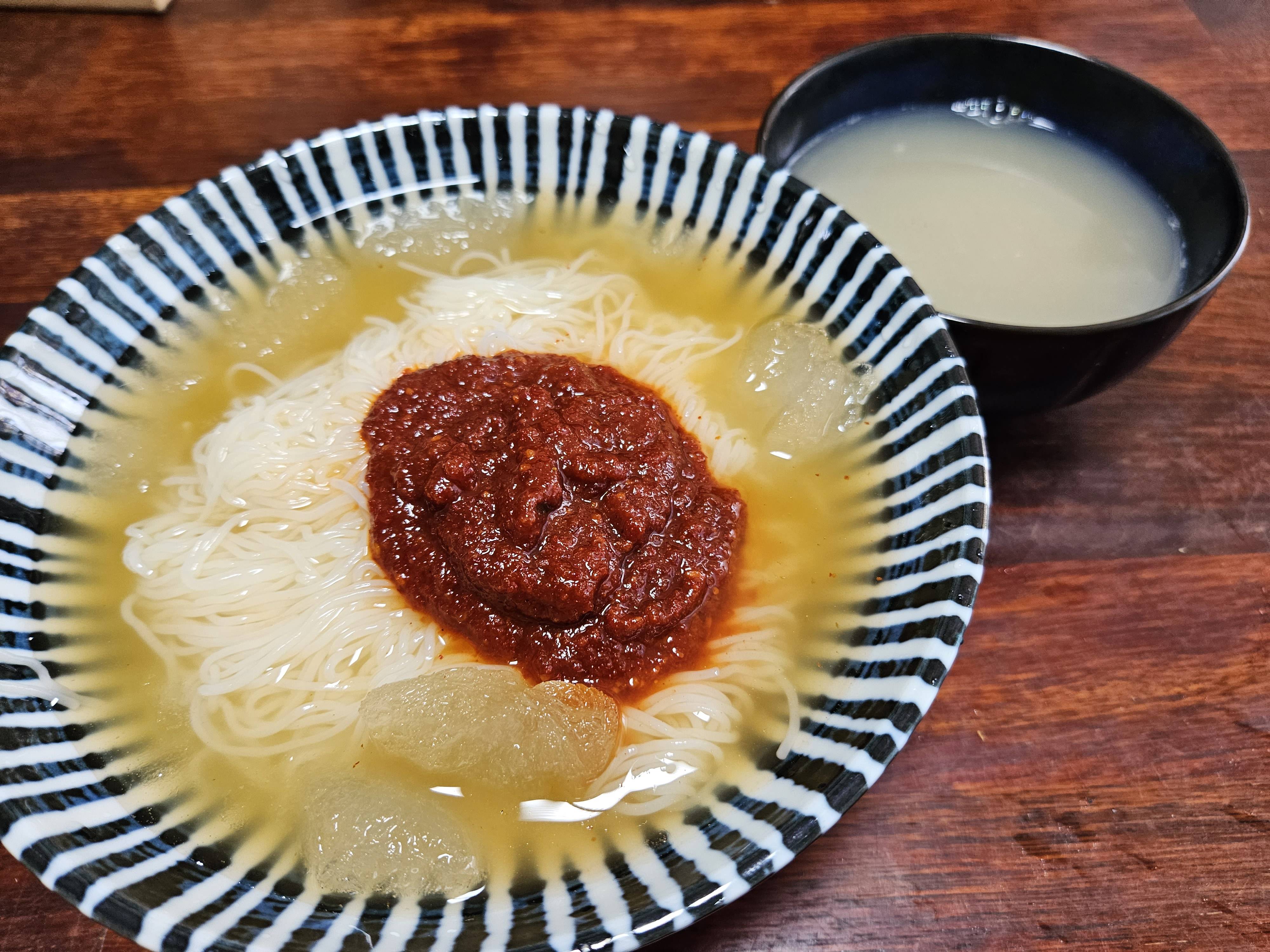 밀면 삶은 물 + 소고기다시다 + 맛소금 + 다진마늘 + 후추