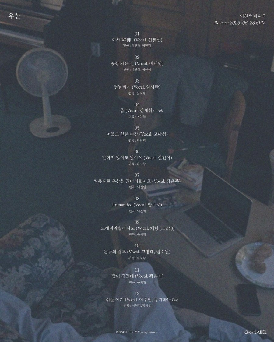 "남몰래 1년 넘게 준비했던 프로젝트 앨범을 이번 달 발매합니다. 가벼운 마음으로 시작했는데 제 정규앨범을 작업할 때만큼 애정과 노력이 들어갔다. 제가 쓰지도 제가 부르지도 않은 노래로 채우는 첫 앨범입니다. 하지만 그 외에 모든 것을 했다. 비 오는 날 우산을 쓰는 것처럼, 나 혼자 들어갈 만한 공간이 필요할 때 찾게 되는 앨범이 됐으면 좋겠다"