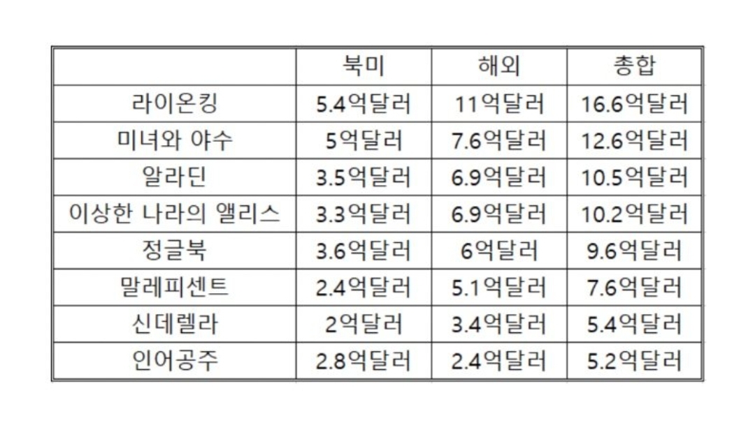 비슷한 제작비인 라이온킹? 응 매출 16.6억달러 흑어 3배