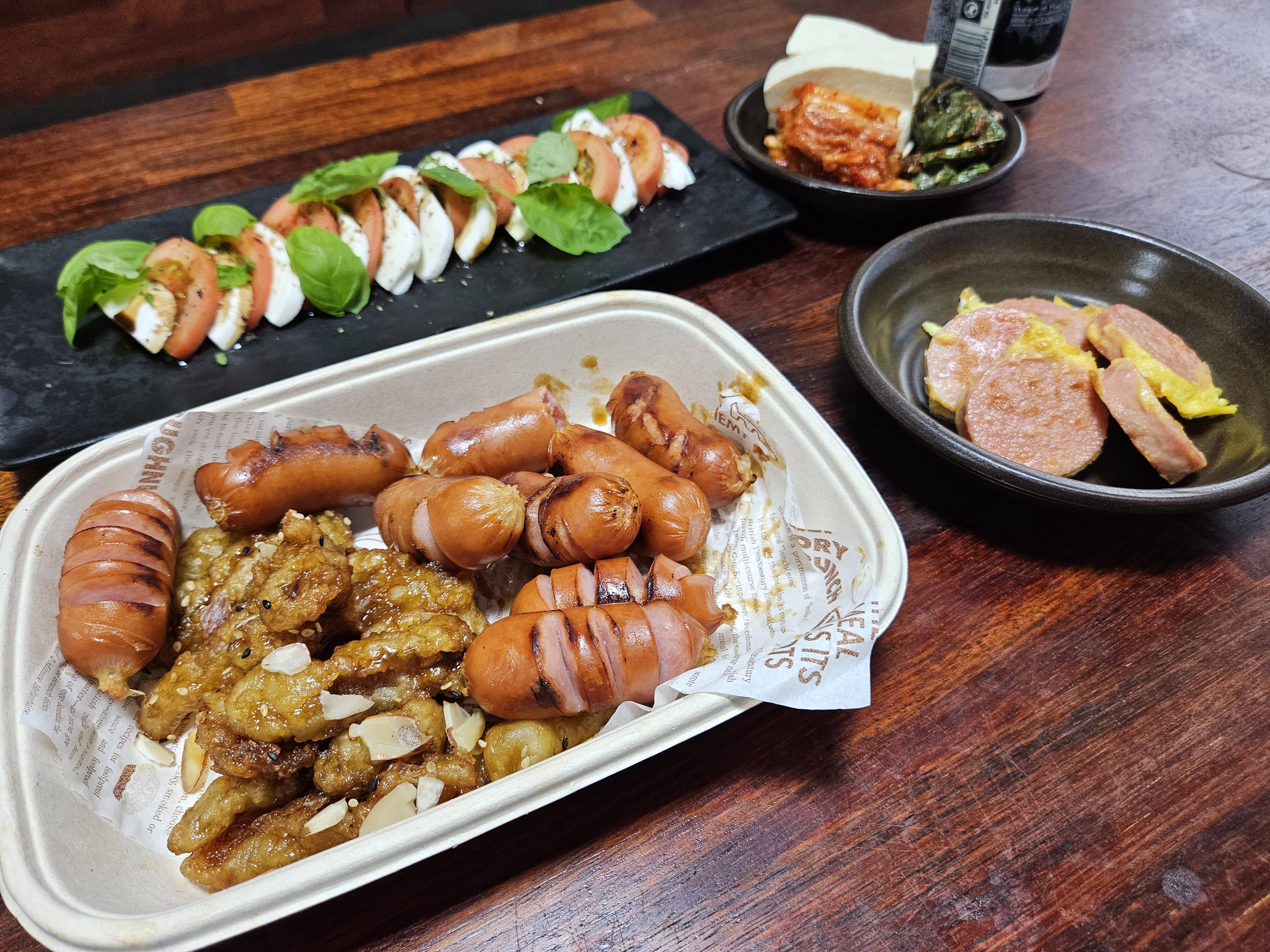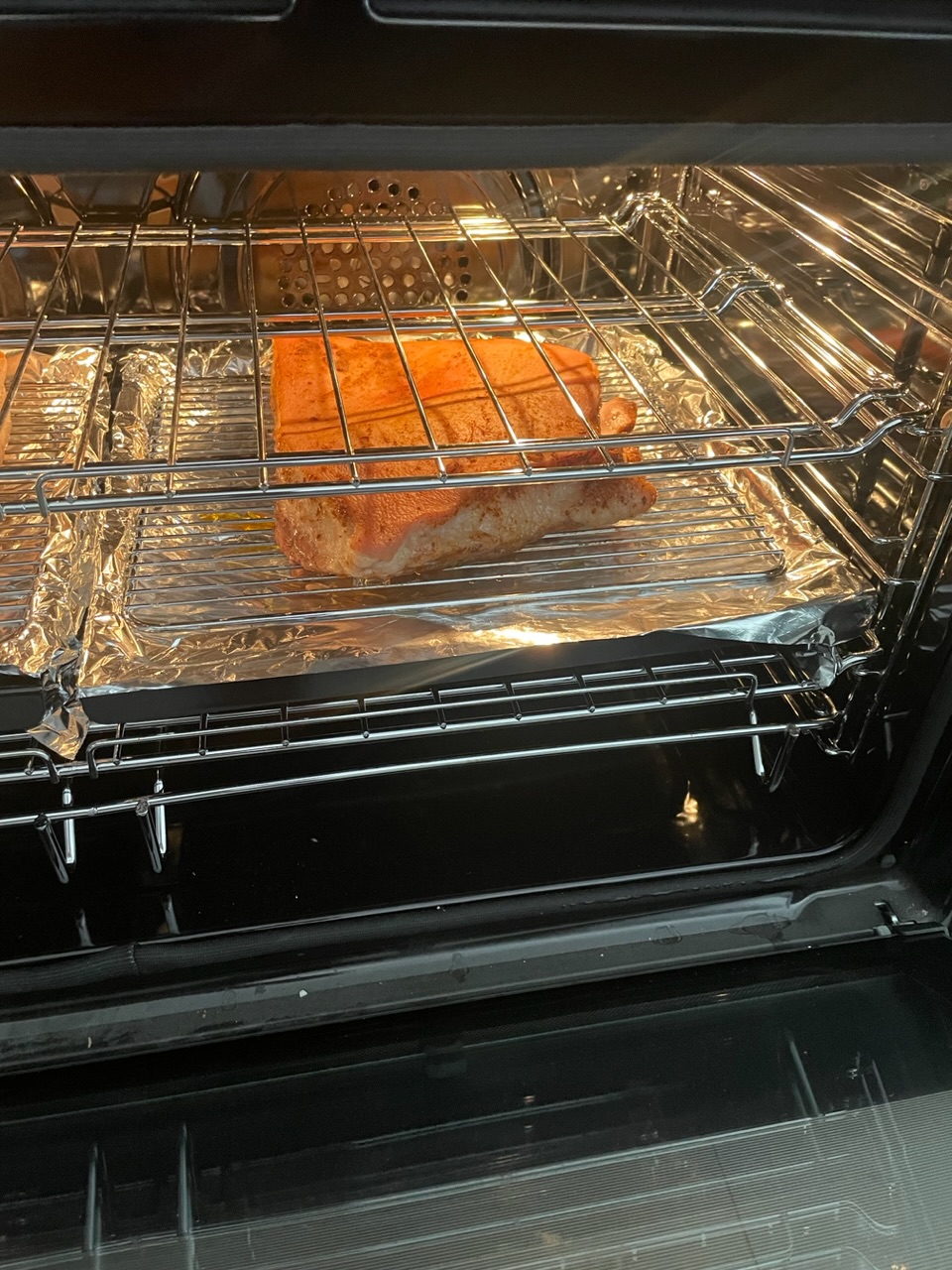 ㅇㅇ 통삼겹 5키로짜리 하나 사서 반 자른뒤 하나는 그냥 넣었고 다른 하나는 이거저것 가루들 섞어서 발라다가 굽는중