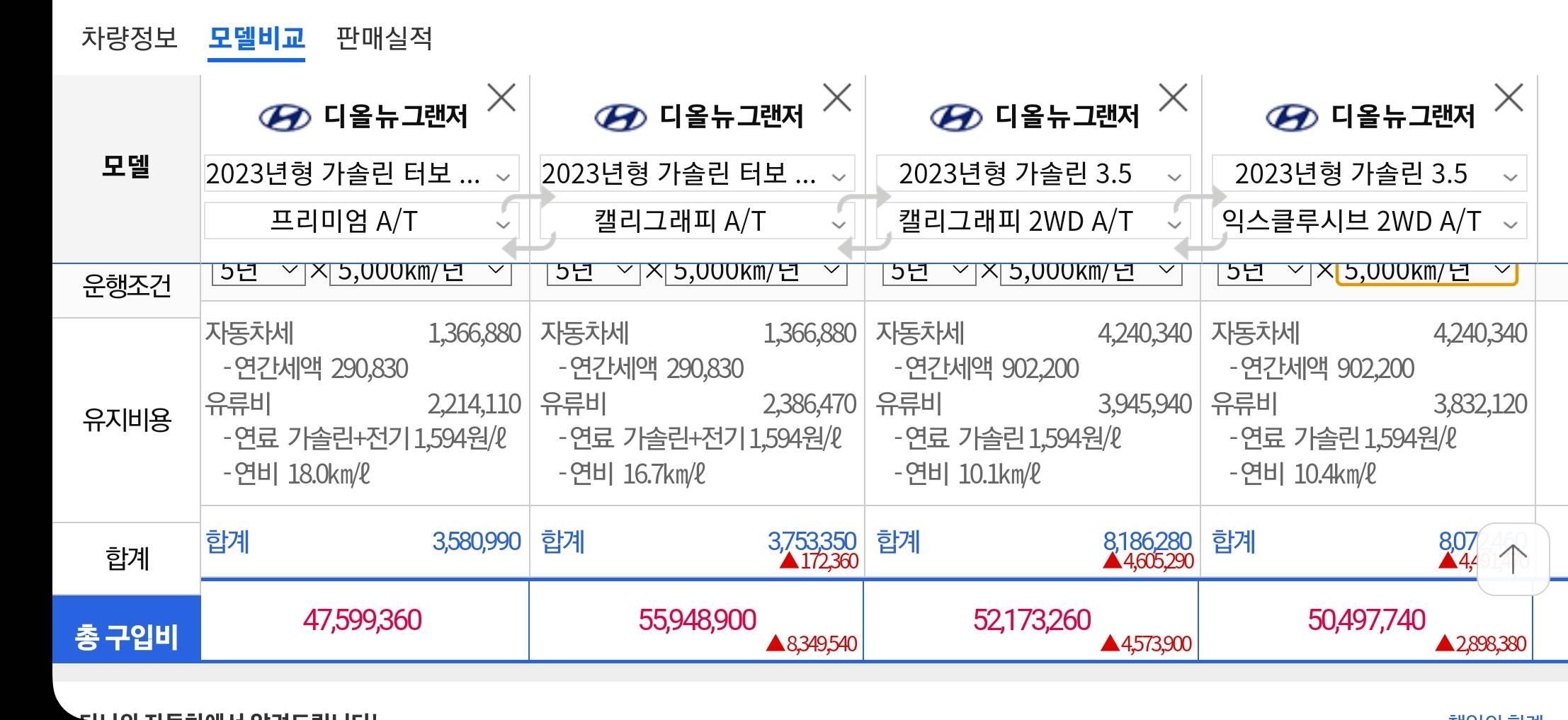 순서대로 하브 제일 낮은 트림, 하브 풀옵, 가솔린 풀옵, 가솔린 중간옵