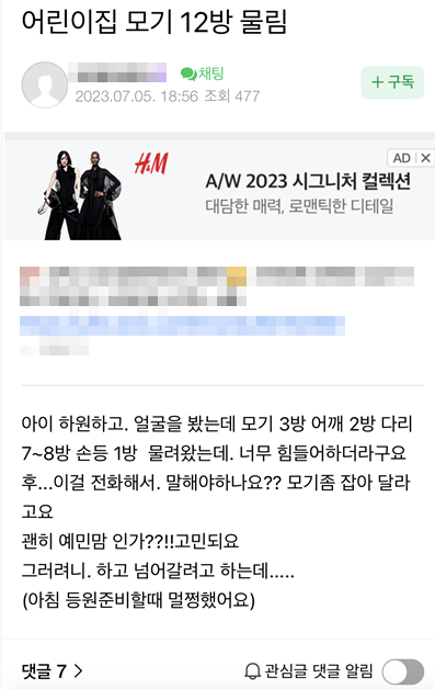 내딸래미 모기 알러지 같은거 있어서 물리고 심하면 고름도 차고 퉁퉁 붓는데...저정도 물리는거면 원에서 모기 키우는거 아니냐? 쟤만 물리는것도 아니고 방충망치고 약좀 뿌리면 저렇게 안될거 같은데..