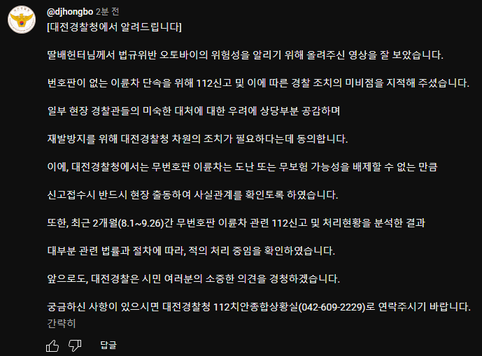 이 올라오면서 분위기 심상찮음을 느낀 대전 경찰청 측의 댓글