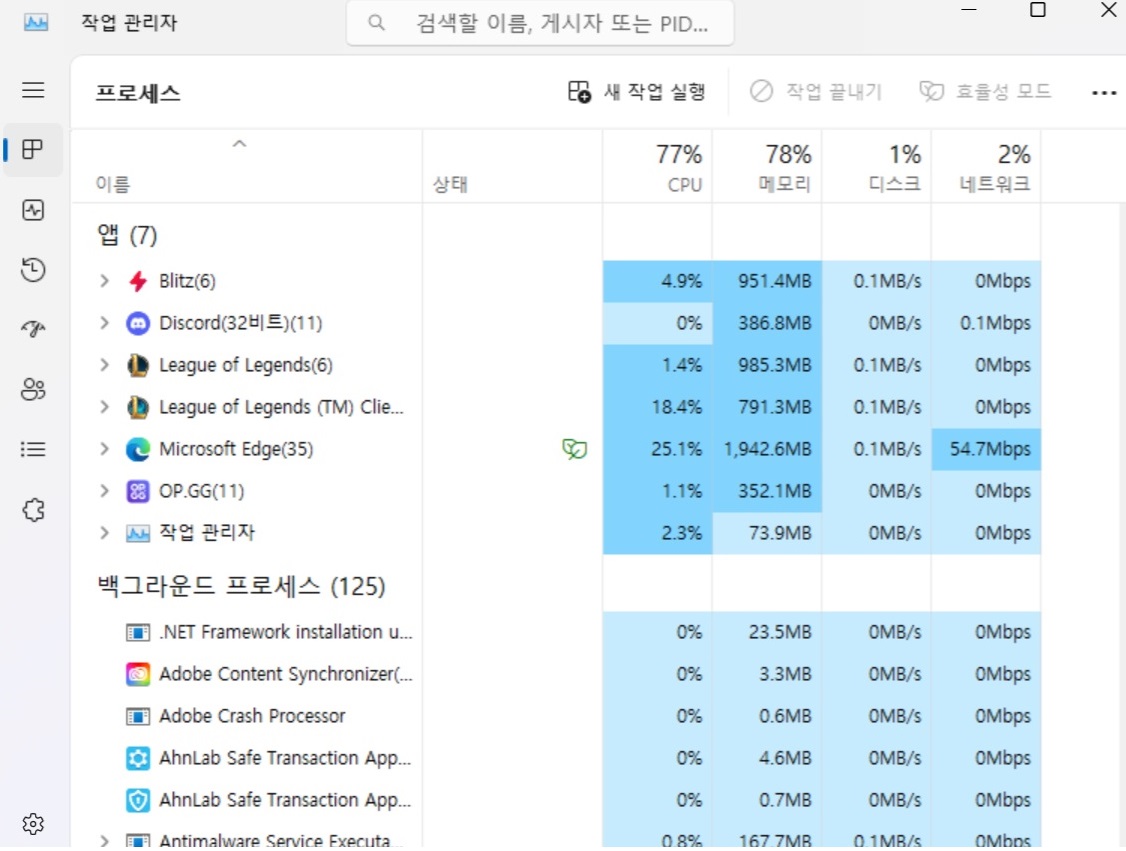엣지는 유튜브를 고화질을 좀 열어놨고, 겜조처럼 실시간 댓글기능 올라가는거 있는 사이트 두어개 열어뒀음