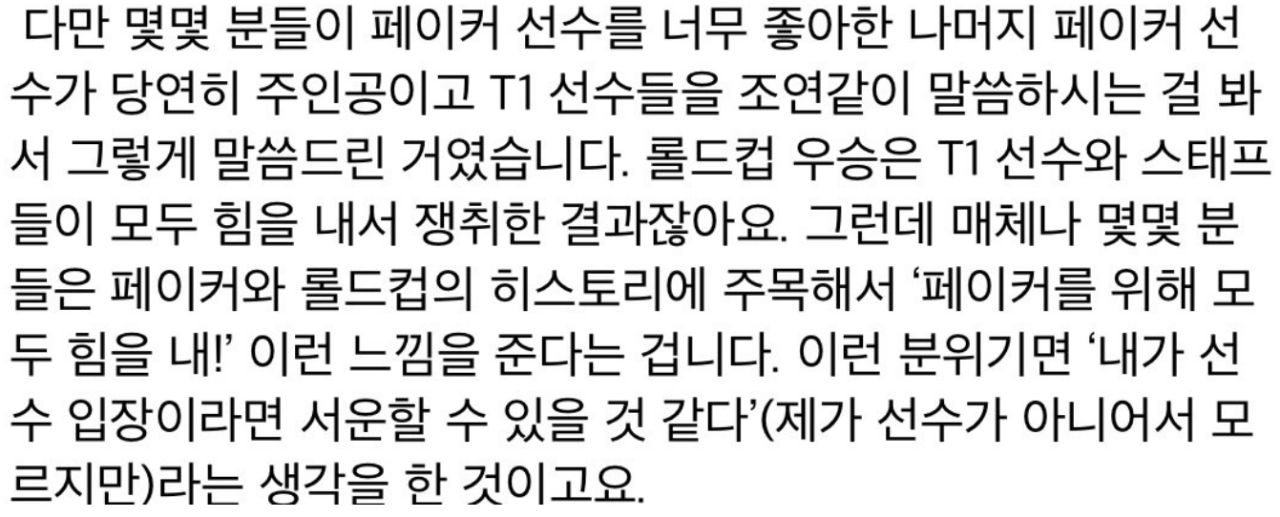 T1팬을 벗어난 영역에서는 (그나마 아는 유명 선수인) 페이커에 이목이 쏠리는게 사실이고, 여러 영상이나 스토리도 페이커 위주로 나오는게 맞음. 그러니까 침착맨도 대충 접하는게 페이커 페이커 하고 나머지 4명은 자긴 이름도 잘 못들어봤으니까 어 얘들 너무 소외되는거 아냐? 하고 케리야 초대하는데 페이커 얘기 고만해 뭐 이런식으로 한 말 같은데