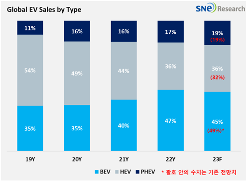 2023년 전기차 침투율 역시 기존 전망 대비 1.3%p 하락한 16.2%로 예측되는데 이는 판매된 전기차의 Type 비중 역시 변화가 있었음을 나타낸다. 꾸준하게 비중을 늘려가던 BEV의 경우 기존에 49%로 전망됐으나 오히려 45%로 하락하였다. 이는 보조금 감축 및 폐지로 인한 중국에서의 BEV 비중 감소, 유럽지역에서의 HEV 비중 증가에 따른 것으로 보이며, 전 지역에 걸쳐서는 높은 순수전기차 가격과 충전요금 및 인프라 부족으로 인하여 기존 예상보다 PHEV와 HEV가 감소세를 보이지 않은 것으로 분석된다.