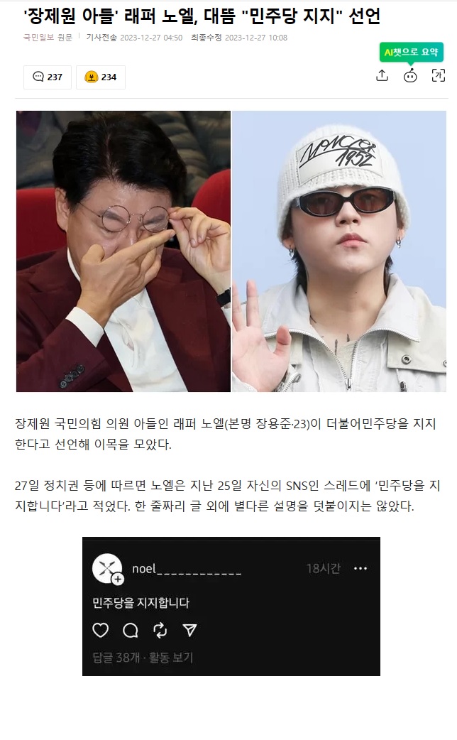 아무리 개개인의 자유가 있다곤 하지만 아빠가 a당 국회의원인데 대놓고 자기는 b당 지지한다고 공개적으로 씨부리면 아빠 입장에서 얼텡이 없을듯 자식 농사 망한거지
