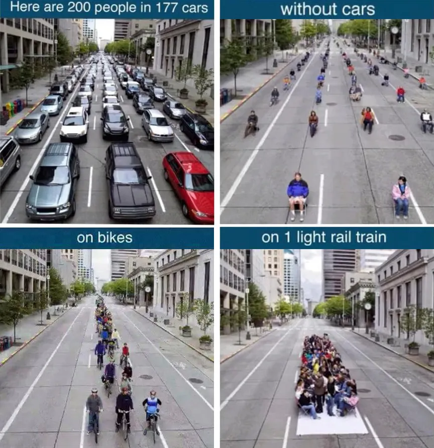 대중교통 특히 지하철, 트램같은 대형운송수단이 승용차에 비해 얼마나 압도적인지 보여주는 그림