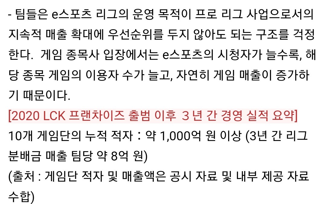 그러니까 내가 잘 모르지만 저 글만 가지고 유추했을 때 - LCK운영법인은 물론 라이엇이 만든 것 - 근데 운영(리그를 통한 부가가치 창출)을 존나 못해서 리그 참여팀에 분배금이 거의 안돌아가고 있고 그마저도 역성장 중 - 그 이유는 라이엇 입장에서는 리그는 게임 홍보 목적만 달성하면 자기들은 유저 유입돼서 돈버니까 된거고, 리그 자체의 부가가치 창출에는 크게 관심없기 때문?