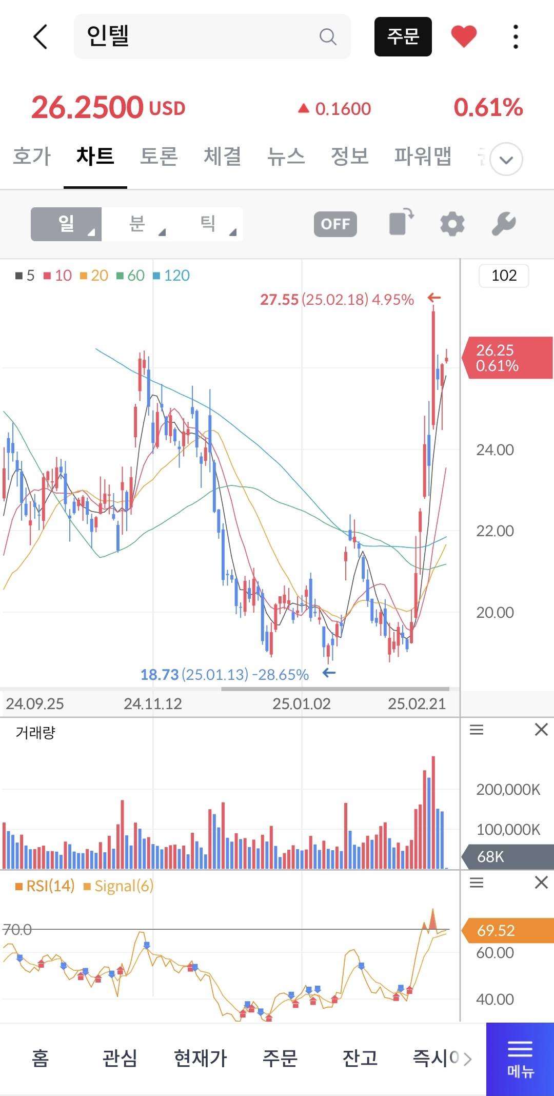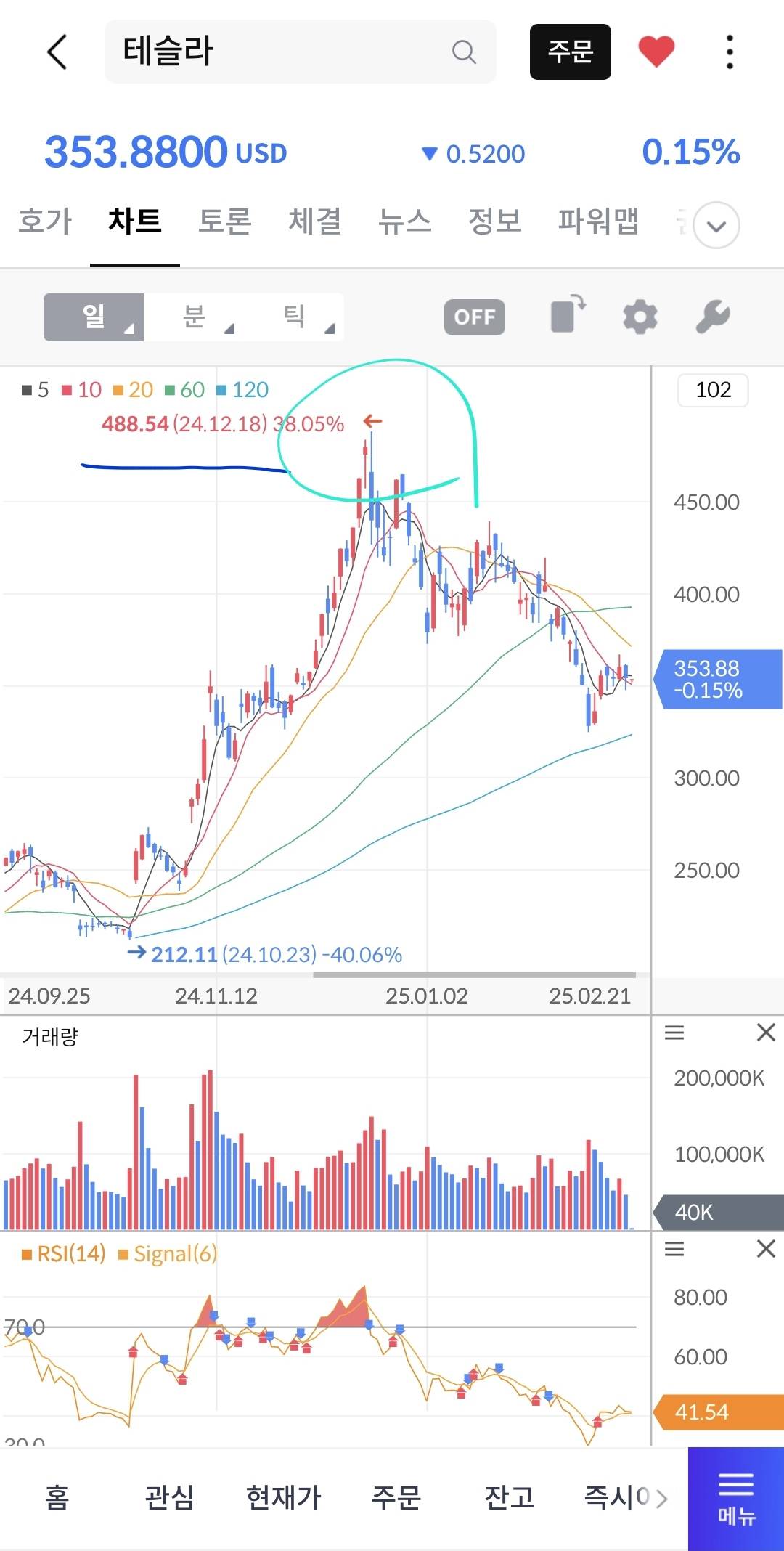 테슬라-전형적인 테마주로 속칭 사팔하는종목 차트도 전형적인 개잡주무빙인데 다른게 있다면 얜 근본이 있는놈이라 매수매도 타이밍이 잘맞으면 수익극대화 못맞춰도 손해는 안보는 종목. 이평선이랑 rsi만 가지고 매수매도 해도 먹고들어간다