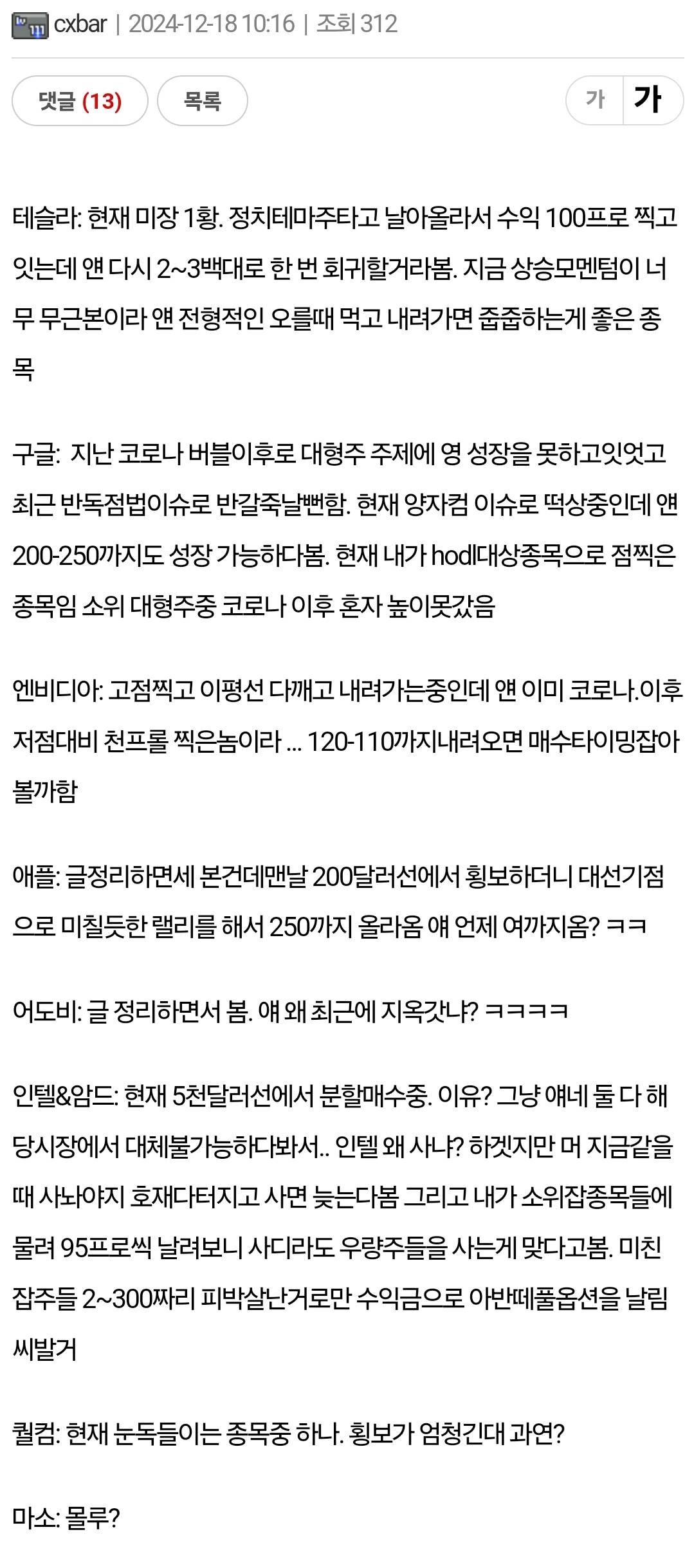 구글: 저 글쓴날짜기준 떨어지진 않았는데 잘순항하다 중간에 악재터지고 고꾸라짐 ㅡㅡ 비중가장큰 종목인데 ㅅㅂ... 덕분에 더매수함.. 구글은 그냥 과거의 테슬라나 엔비디아처럼 미장전체를 캐리하는 대장주가 되는날이 한번올거라보고 투자