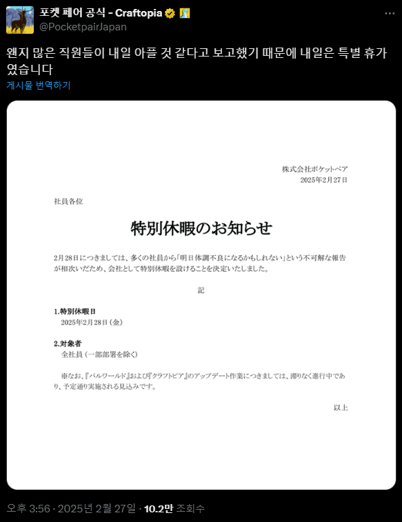 그냥 내일 쉬기로 한 팰월드 개발사 포켓페어