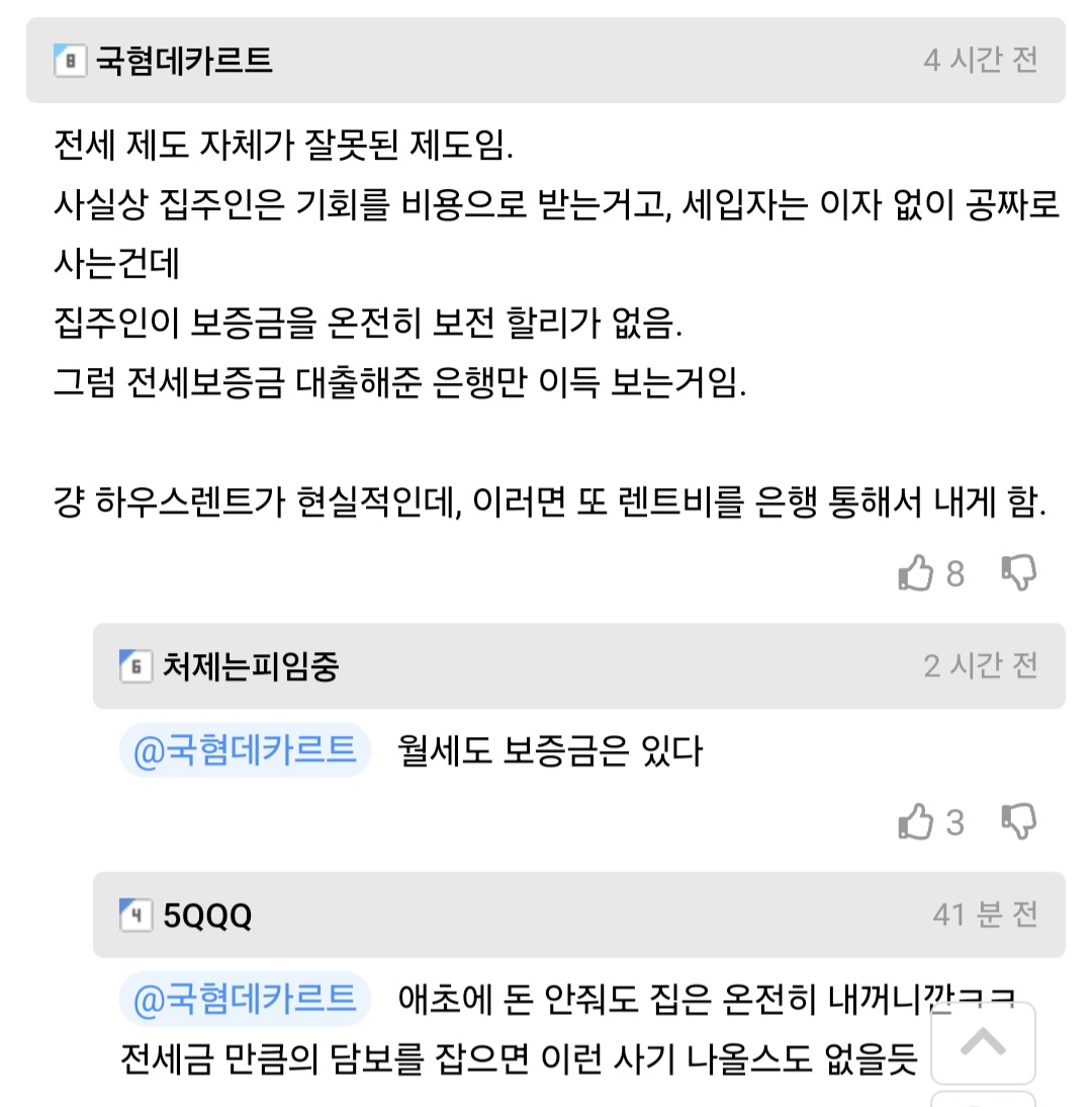 세입자는 전세보증금만큼의 시드머니랑 시드머니가 가지고 있는 잠재적 투자가치와 부동산상승기에 투영되는 가치상승을 집주인에게 양도하는거고 그래서 전월세율이란것도 존재하는데 세입자가 이자없이 공짜로 산다는건 얼마나 경제관념을 좆박아야 나오는 소리임?