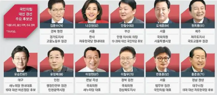 이렇게보니 한동훈이 엄청 젊었네 다 60~70대구만 김문수가 생각보다 나이가 많고 나는 그래도 저중엔 홍준표가 아직도 제일 나은듯함
