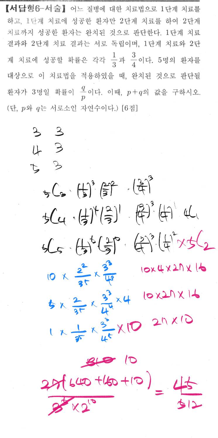 1,2단계가 독립이고 모두 통과해야 완치되는거니까 하나의 시퀀스로 봐서 1/3 * 3/4 = 1/4이 완치 확률 5명중 3명이 완치돼야 하니까 위에 쓴대로 5C3 * (1/4)^3 * (3/4)^2 = 45/512 나오는디 저건 틀린 답인가?