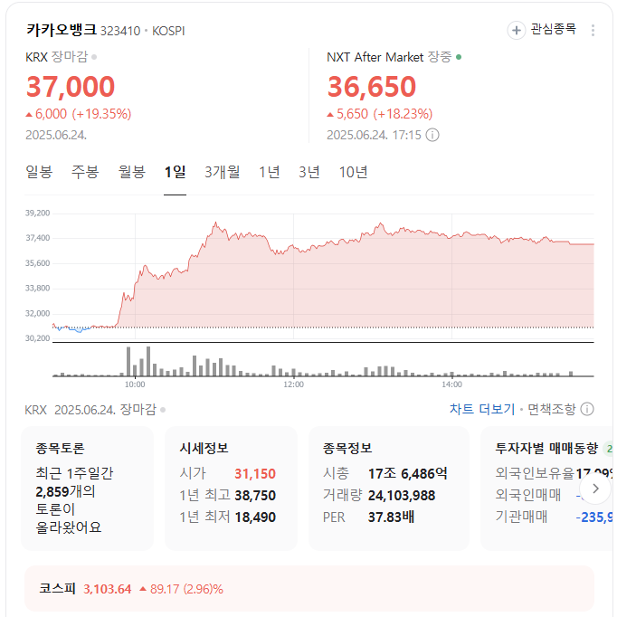 드디어 카뱅 주가가 우리사주 공모가(3만9천원)에