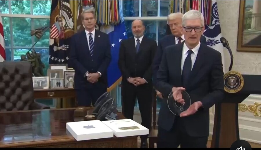 트럼프한테 24K 골드 장식 유리 기념품을 선물로 주는 팀쿡