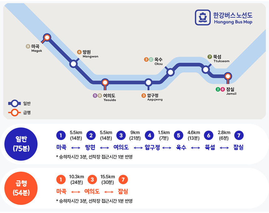 한강버스는 마곡 - 망원 - 여의도 - 압구정 - 옥수 - 뚝섬 - 잠실 총 7개 선착장을 상행(마곡→잠실)과 하행(잠실→마곡)으로 구분해 편도로 운행하며 평일 출퇴근시간대 한정으로 마곡 - 여의도 - 잠실 단 3개의 선착장에만 서는 급행도 운영한다.