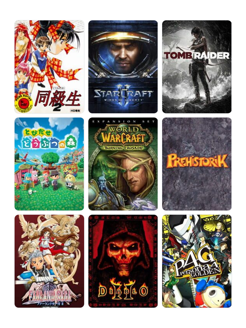 삼국지3,피와기티,소닉더헷지훅,KOF97/98,철권TT,버스트어무브,광명전사,노노무라병원사람들,하원기가일족,하급생,리니지,천사의오후3,레인보우식스,라그나로크온라인,던전시즈3,갓오브워,GTA5,라스트오브어스,페르소나3/5,응석받이,모노크롬판타지,세키로,슈퍼마리오오딧세이,사이버펑크2077,몬헌월드,원신,젠레스존제로,승리의여신니케 등등